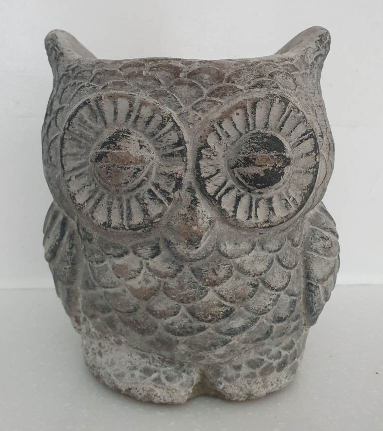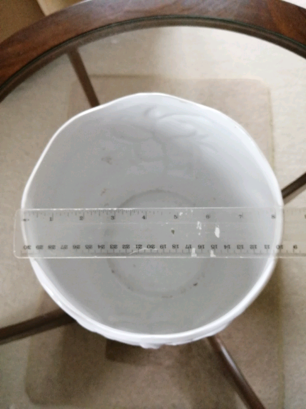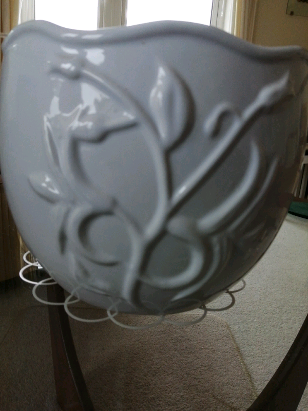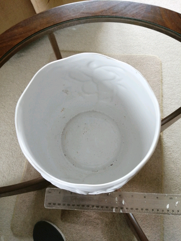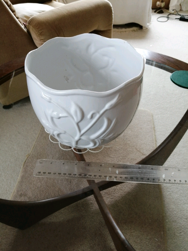 A large white, house Planter in good condition, glazed with a floral scroll pattern, no colour 100%plain white. 7" h x 8" top dia.