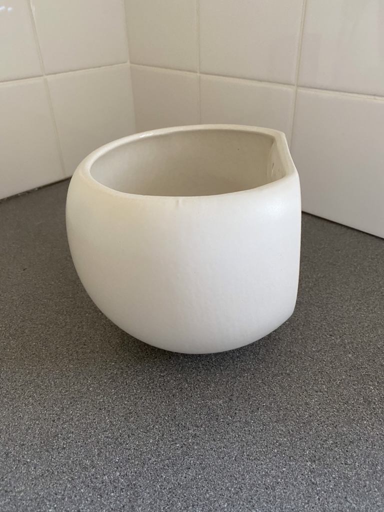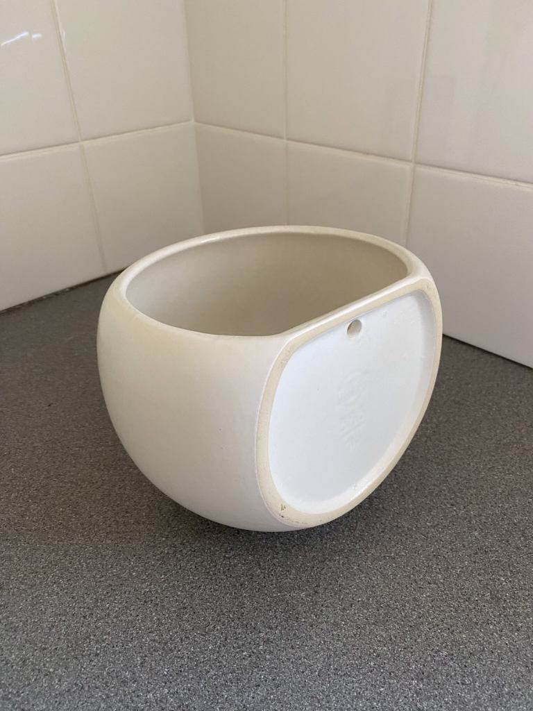 White wall hung flower pot for sale. Inside max diameter 15cm/5.9 inches, height 14.5cm/5.7 inches. Buyer to collect from Westbury Wiltshire.