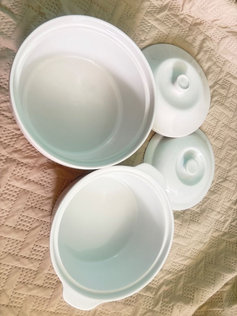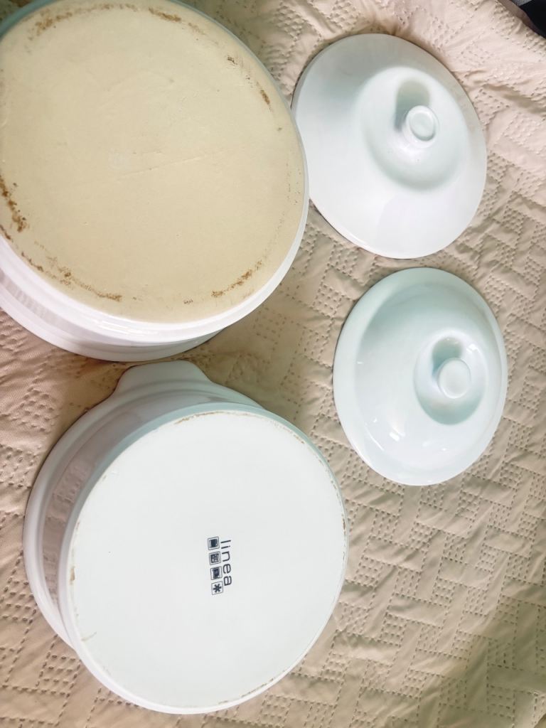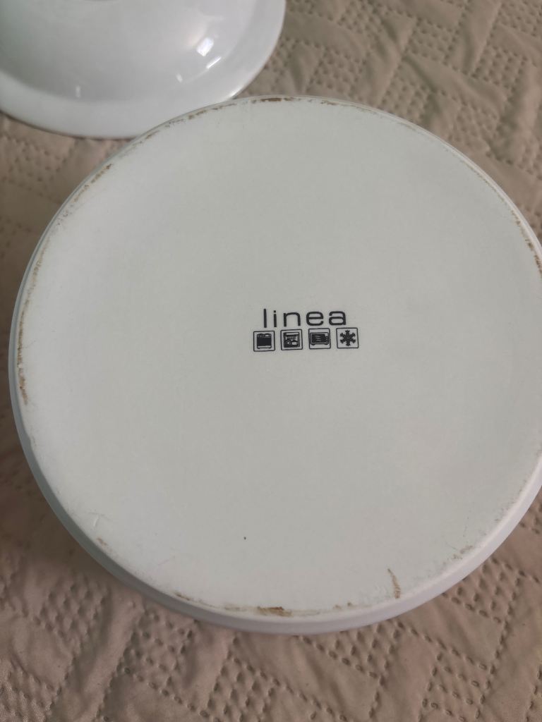 his is a ceramic or porcelain casserole dish from the brand linea. Both new both of £25