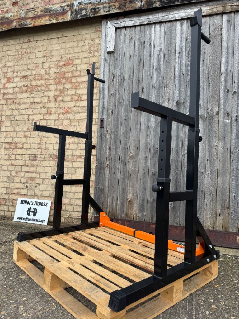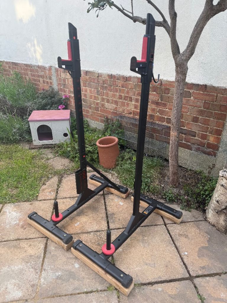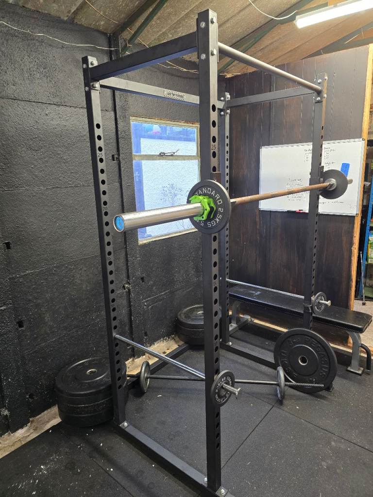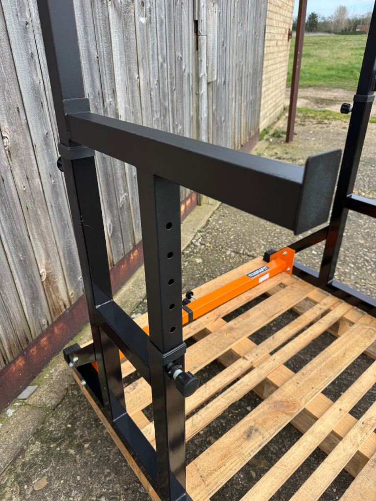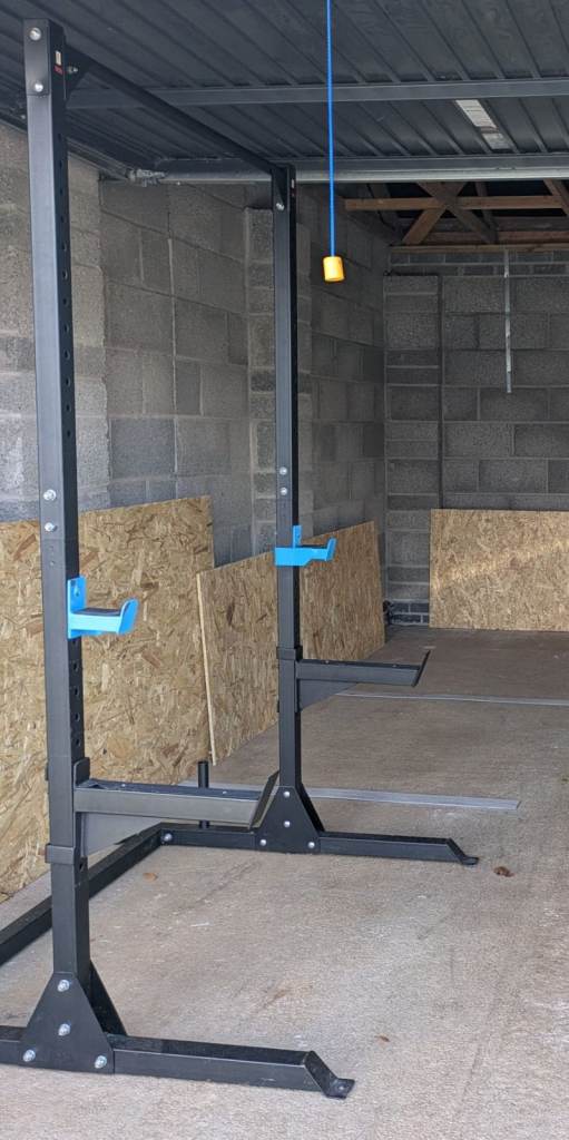 Fully functional M130 squat and bench press rack from Mirafit. Fully adjustable squat rack and spotter catchers. Width adjustable. £149.95 new.