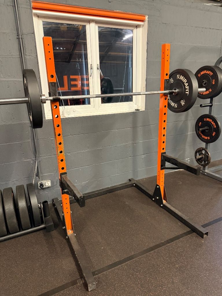 MiraFit squat rack / squat stands for sale in orange & black. Solid, stable setup and ideal for a home gym or garage gym.