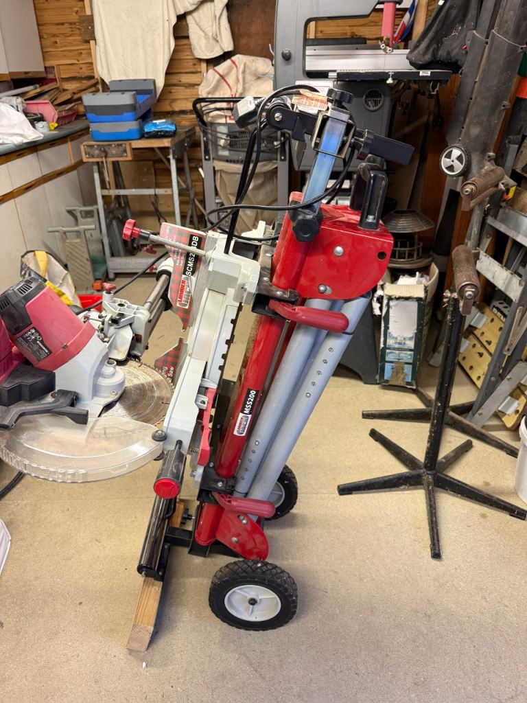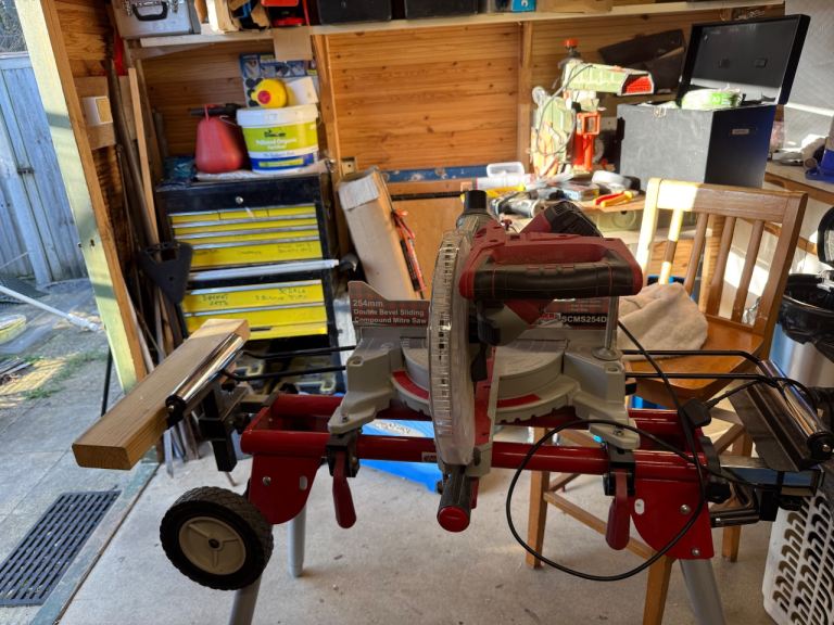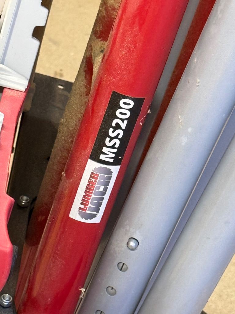 Very little used 254mm Lumber Jack Double Bevel Cross Cut saw with Colapsable stand For storage as seen in pictures