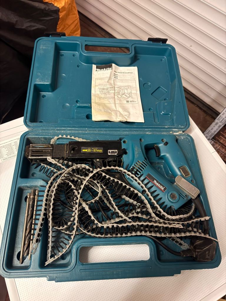 Makita screw gun well used but in full working order. 2 batteries and a charger but no box. Works with 25mm- 55mm collated screws. Pick up only £110.