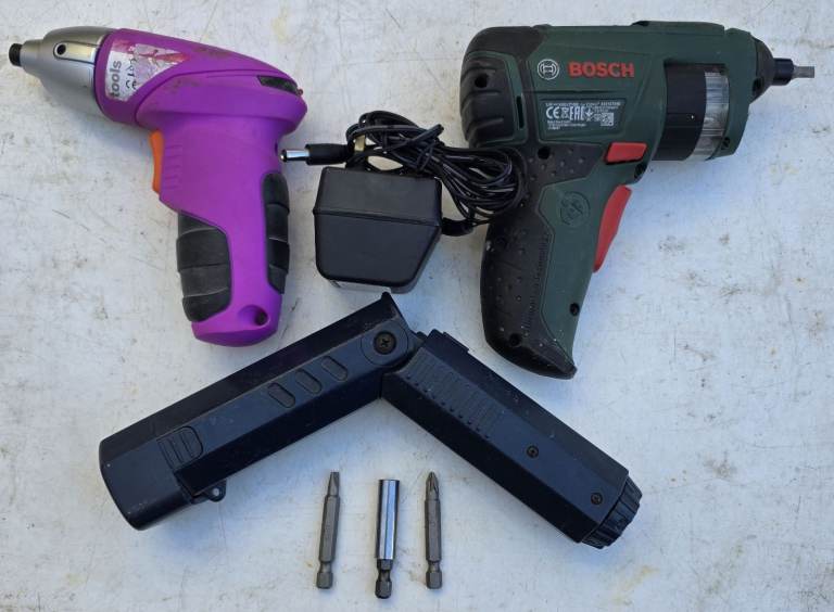 As seen in the pictures I have 3 cordless screwdrivers ONE CHARGER can be used with all and a few bits. There are some extra bits inside the Bosh cartridge. All of them holding charge and working fine. I have many other professional power and hand tools some already advertised some will be when I sort them out. Collection from RM3 7AL post code location. If postage required I have to add another £4 to cover package and postage.