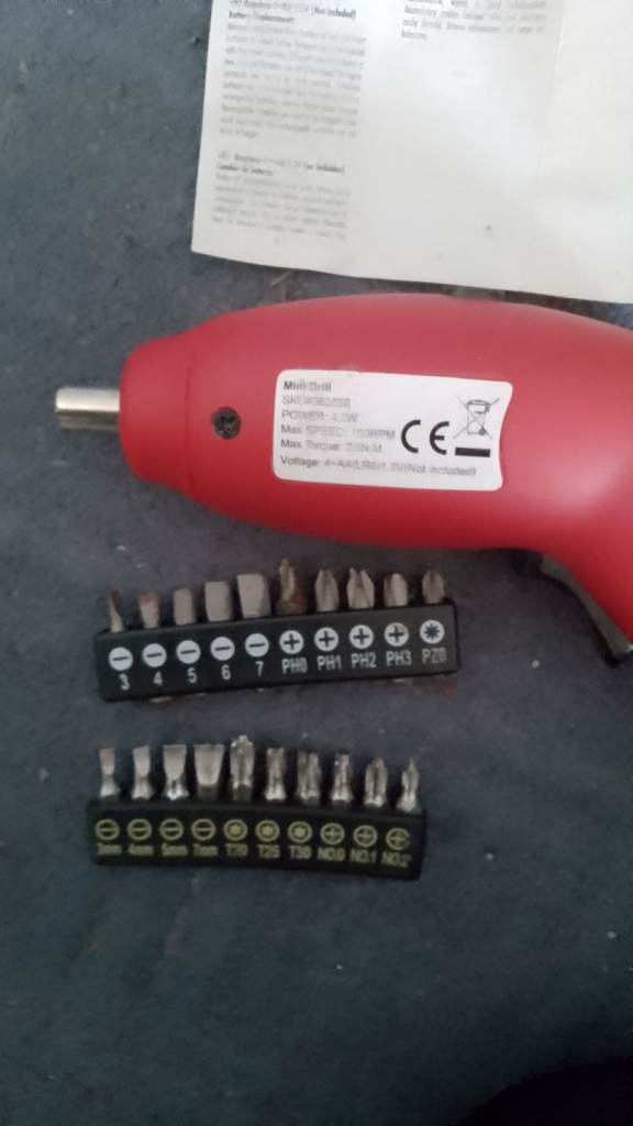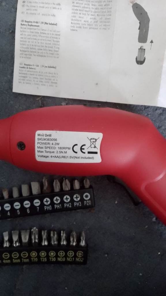 Requires 4XAA batteries (not included). Drill has previously been used in a working environment but still works. I have included the screwdriver bits along with the manufacturer instructions.