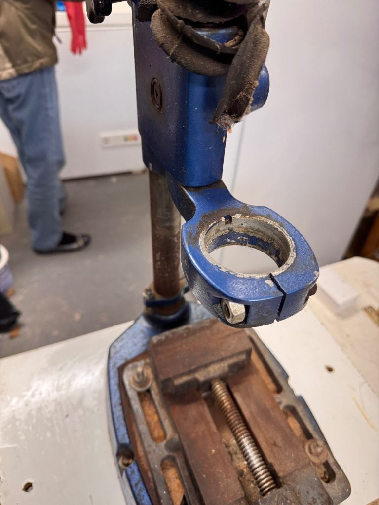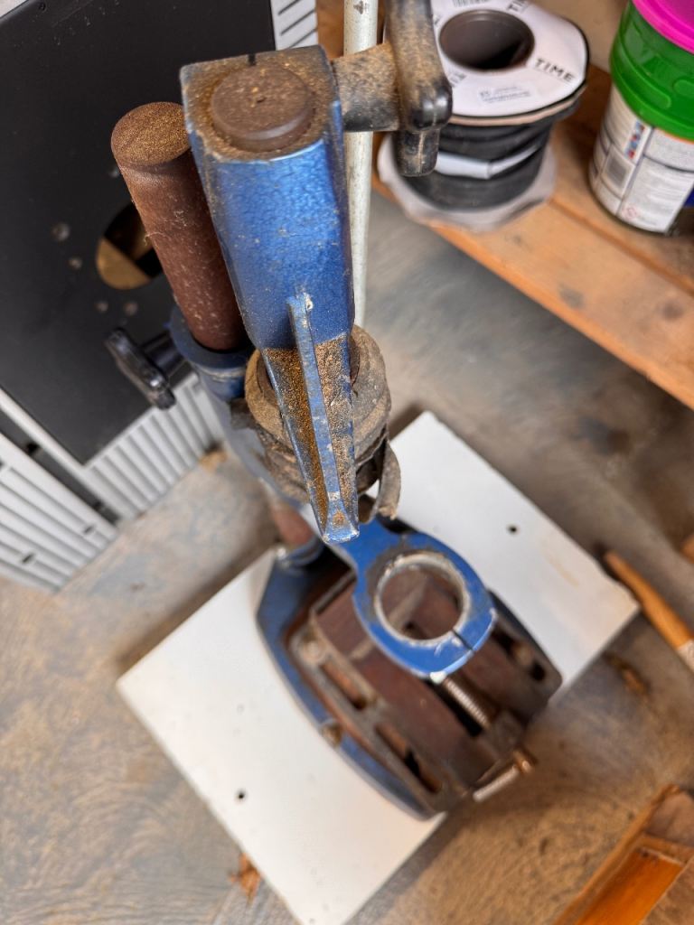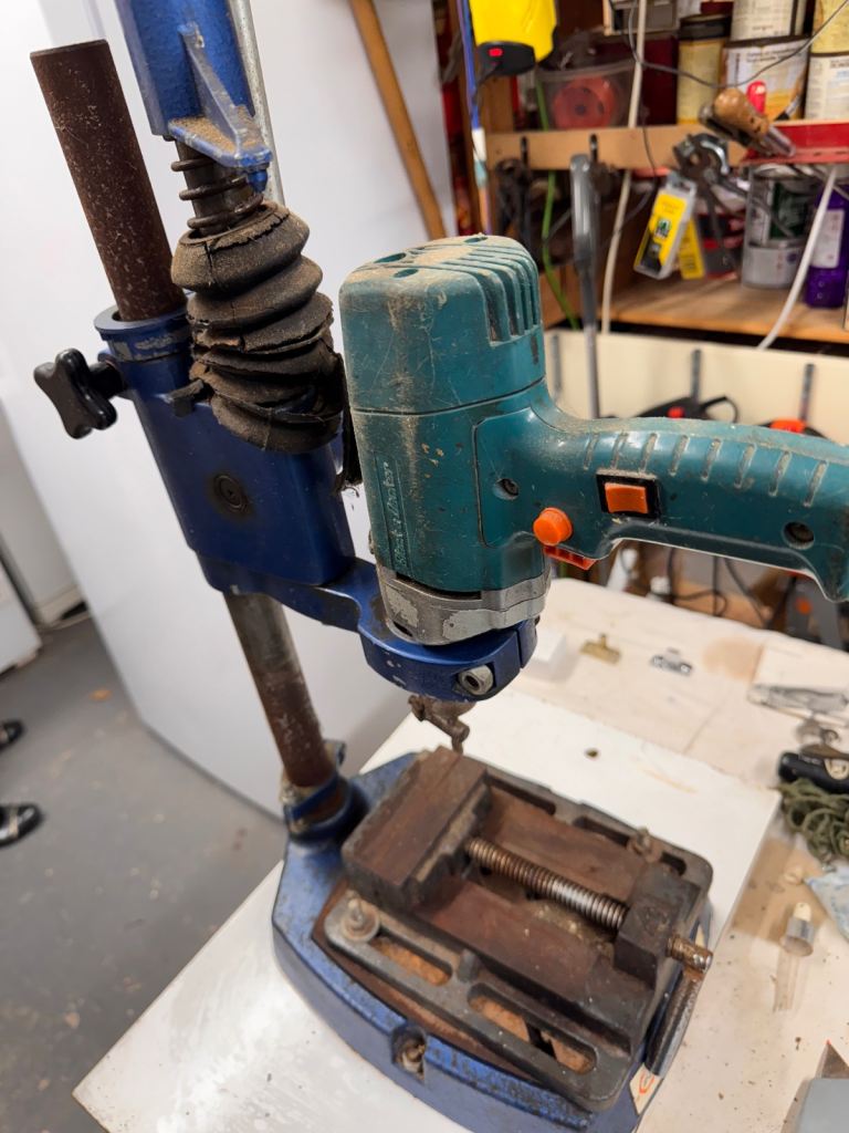 This is an old but sturdy and very heavy Drill Stand that you can easily fit your own drill into and then lower the drill into your wood in a controlled and exactly perpendicular way.