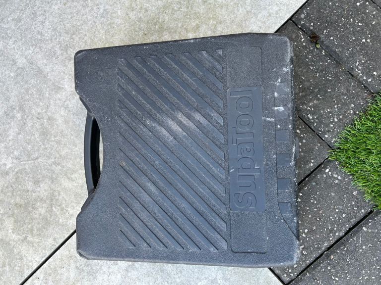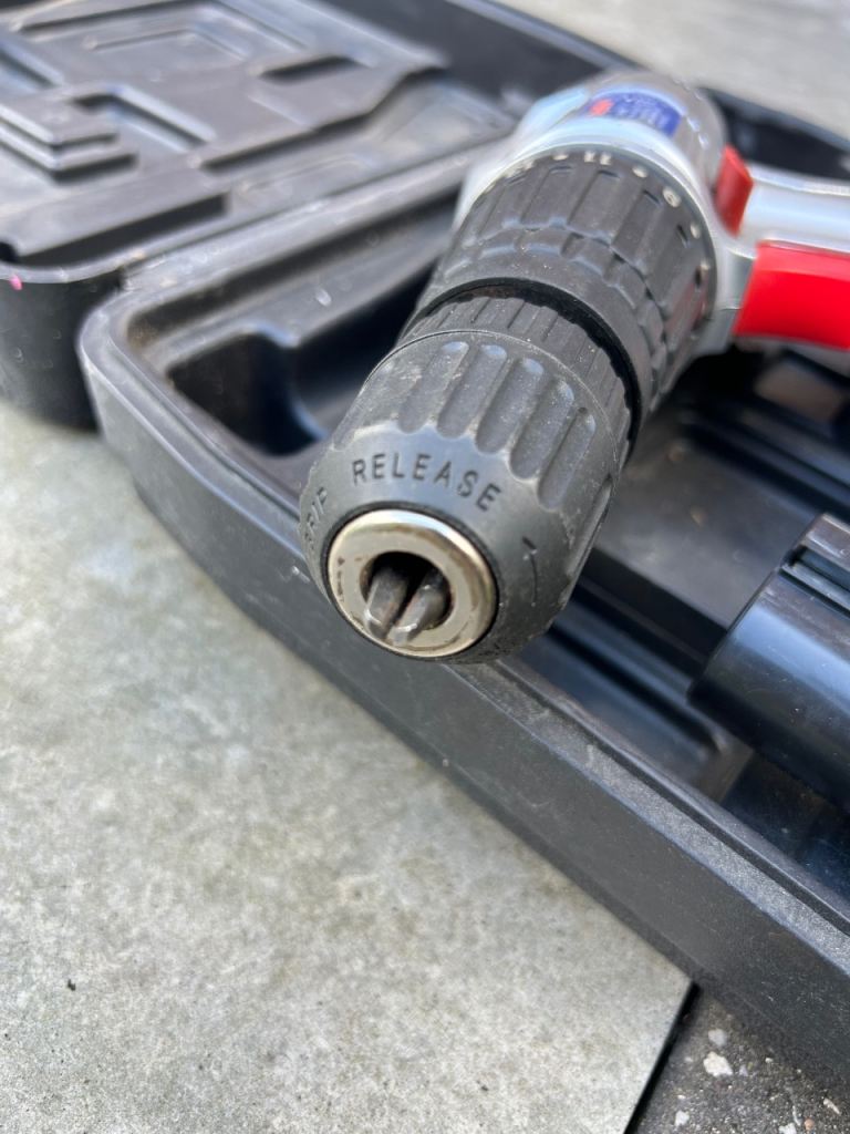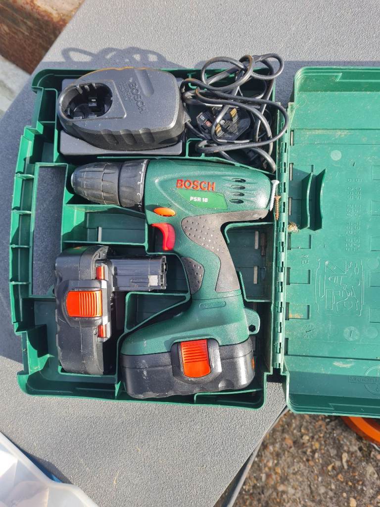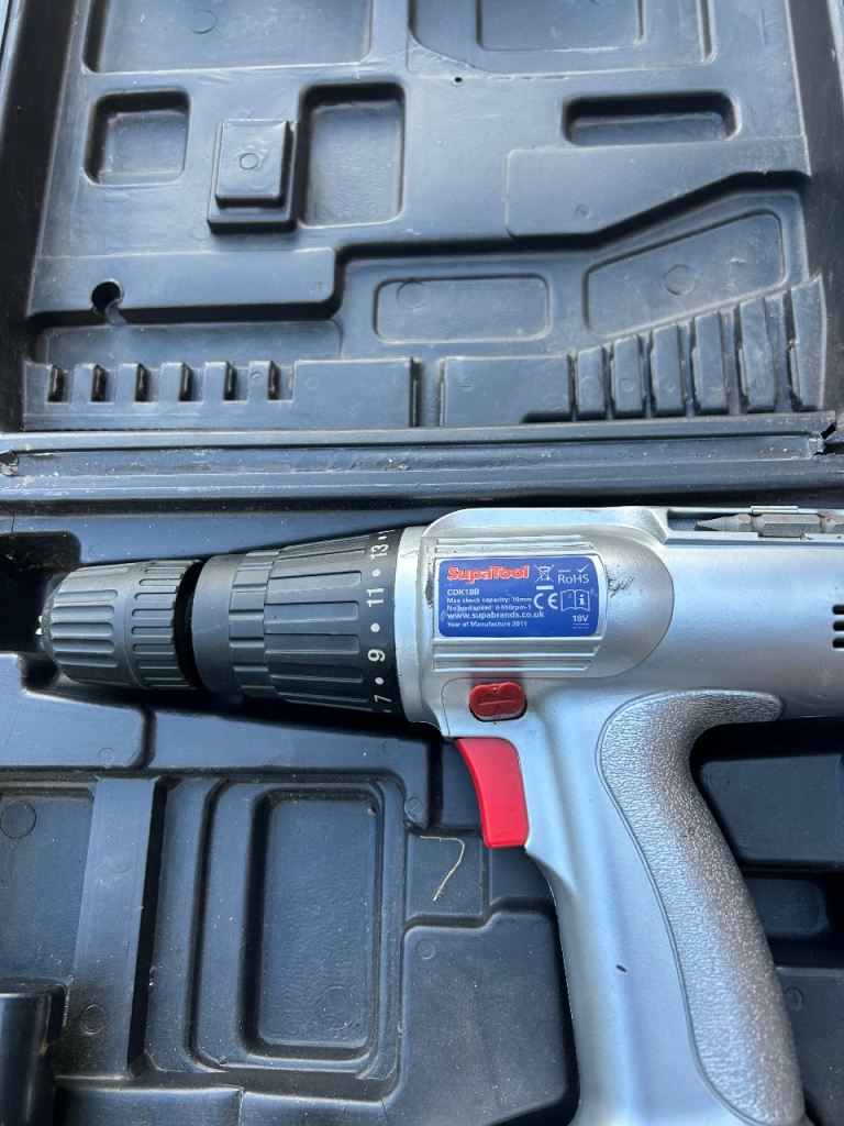 Cordless hand drill in carry case with 2 batteries but no charger.