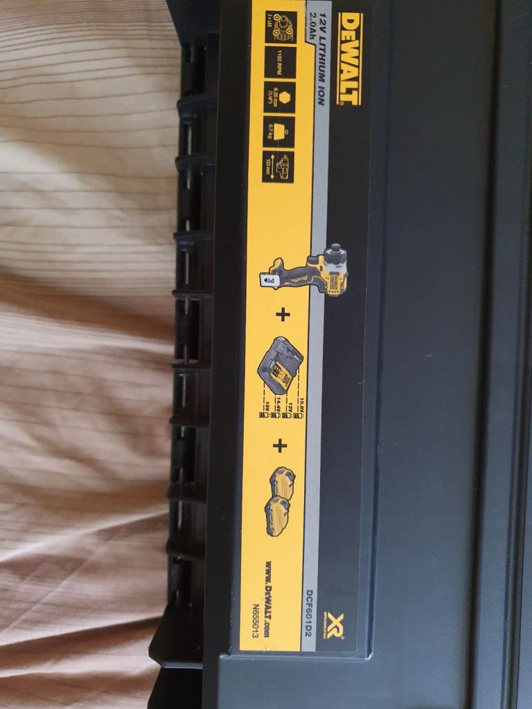 • A Dewalt Screwdriver drill 12V, 2.0Ah 1100RPM, 0.7KG, LED lights, 123mm of length of drill.
