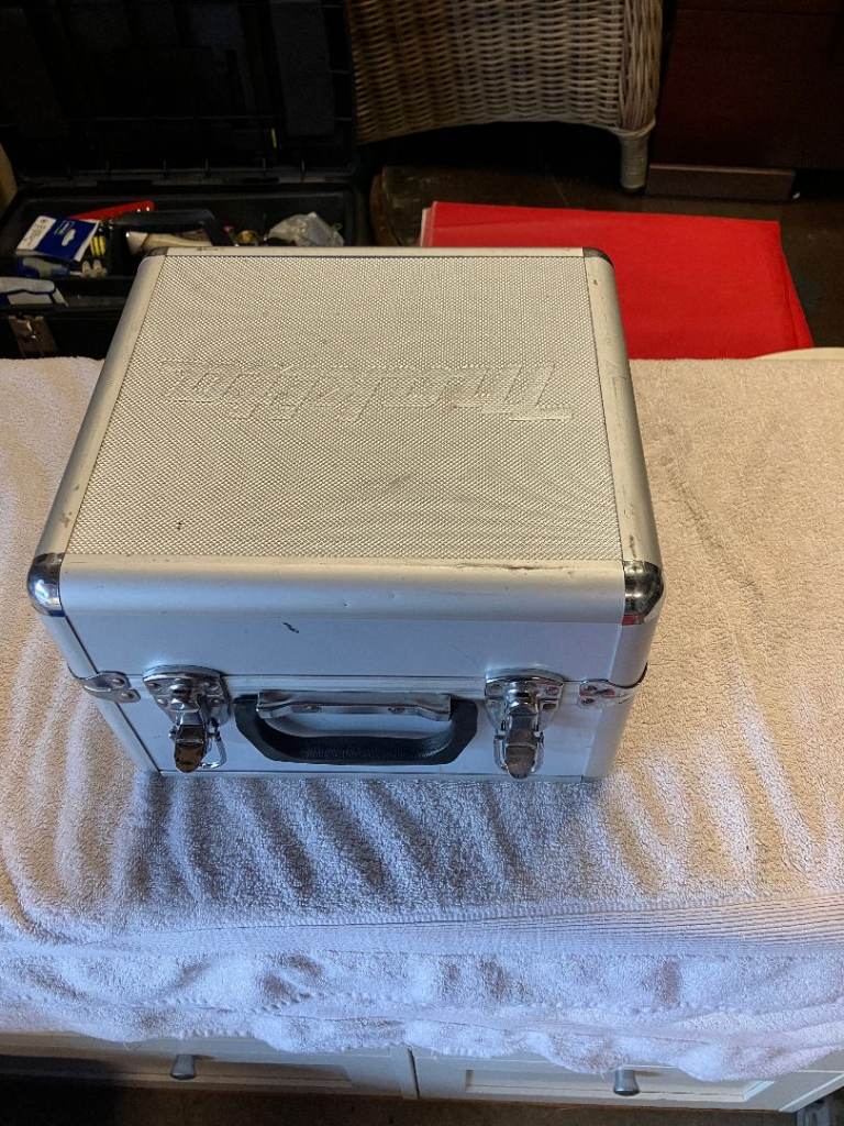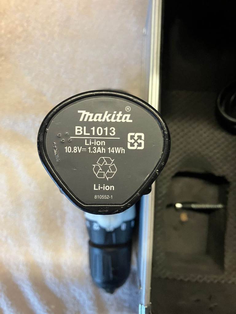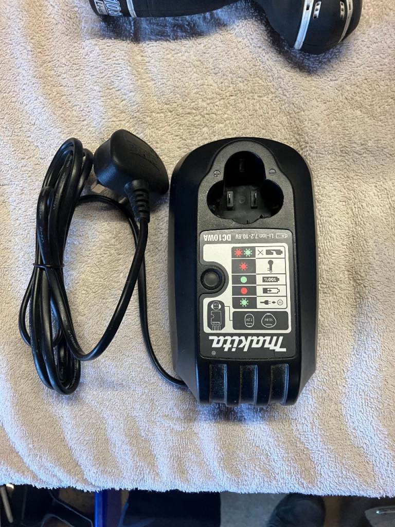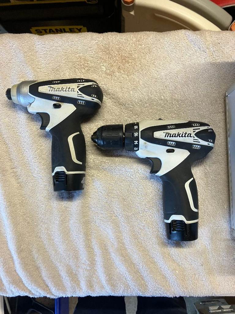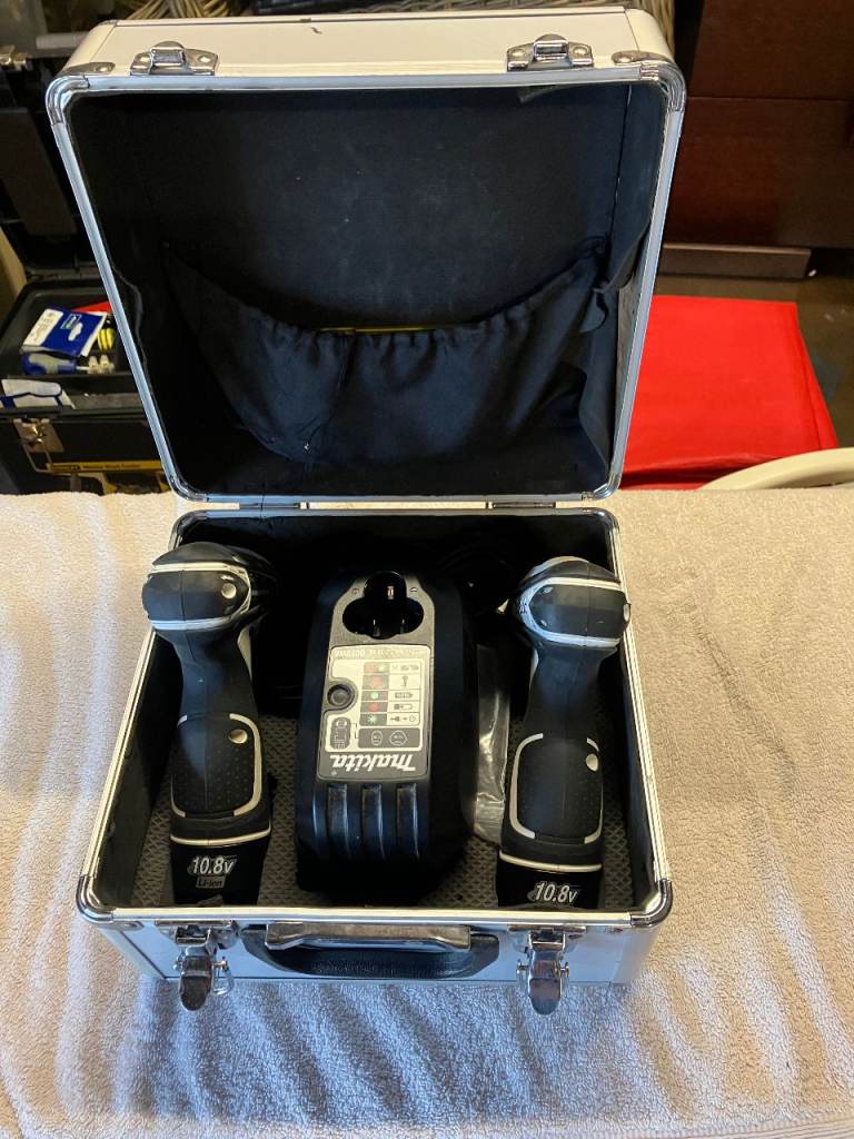 In very good and clean condition is this set of a Makita impact driver and drill with adjustable torque settings, complete with batteries, mains charger and robust metal storage box