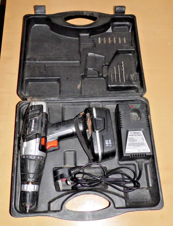 Owned since new and never abused, A Wickes 18v Heavy Duty Cordless Drill with UK Charger and Hardcase and Extras. This Drill is quite heavy once its fitted with its Ni Cad Battery, But what a drill. The drill has 2 speeds with Forward, Reverse amd Trigger lock, Torque settings very from 1 to 15 or then Solid drilling (Max torque from memory is about 45Nm). The next adjustment head is for Standard or Hammer Drilling then the keyless 10mm Chuck for quick and easy operation. The 18v 1.5Ah Ni-Cad Battery is still in Good condition. The drill has 2 screwdriver bits installed Cross/Flat headed bits. In the case there are a few extra bits