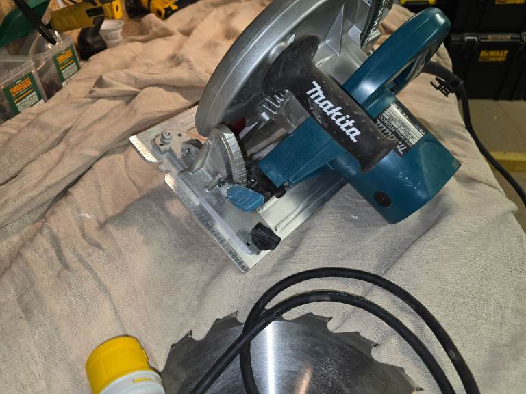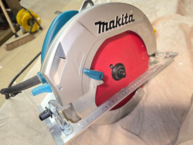 Excellent for cutting thick joists with a spair blade. Track guide missing.
