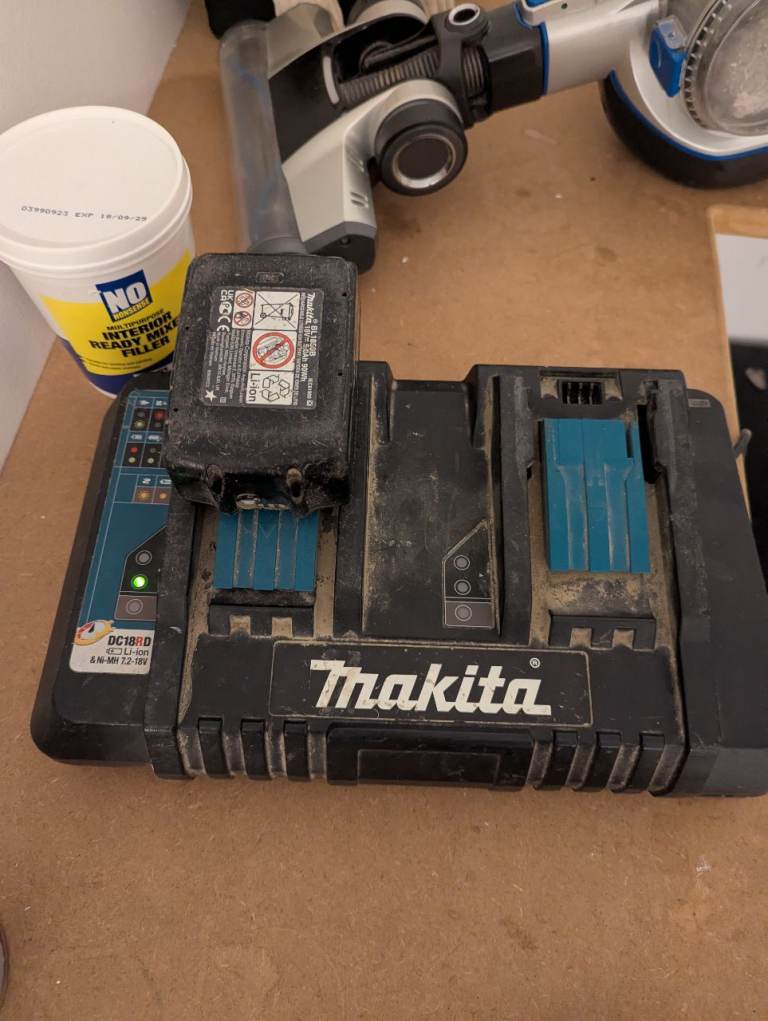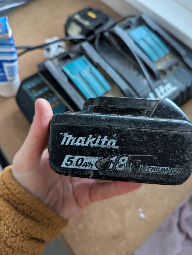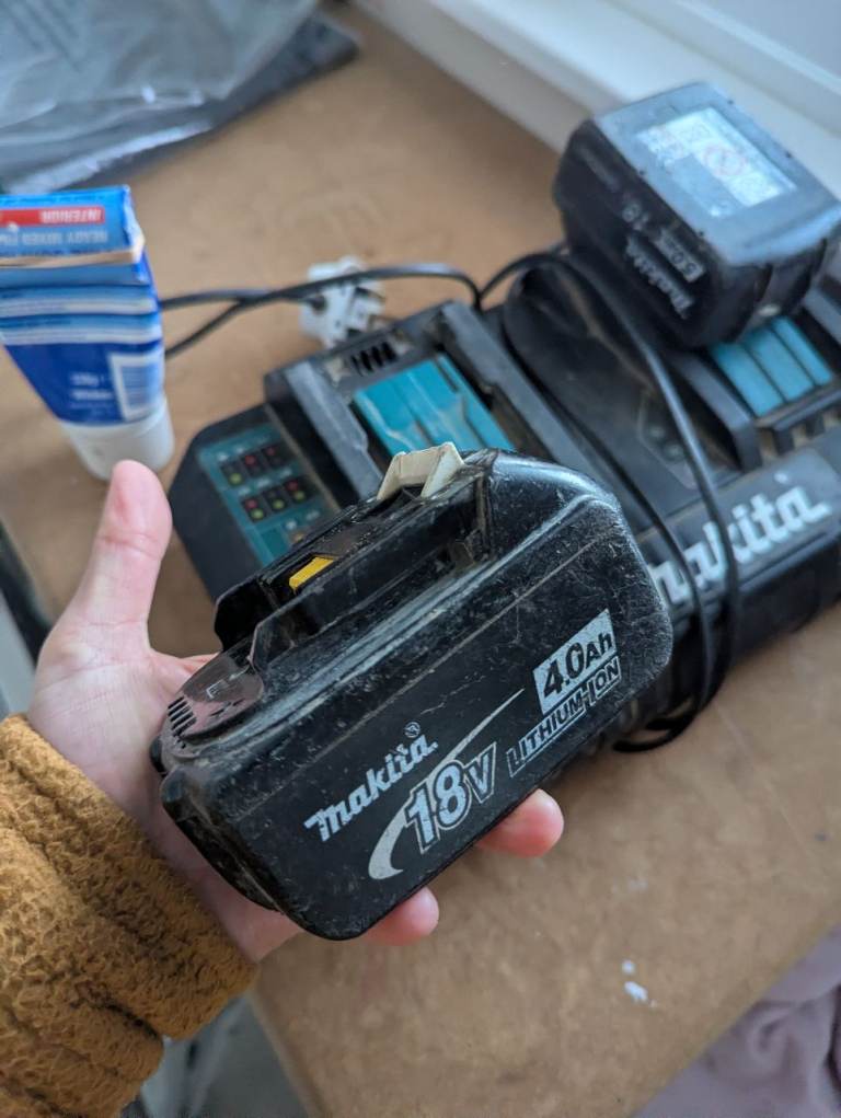 Makita Dual fast charger with batteries. Obviously as you can see it's all a bit marked and scratched but all in good working order. One battery is 5A and one is 4A.