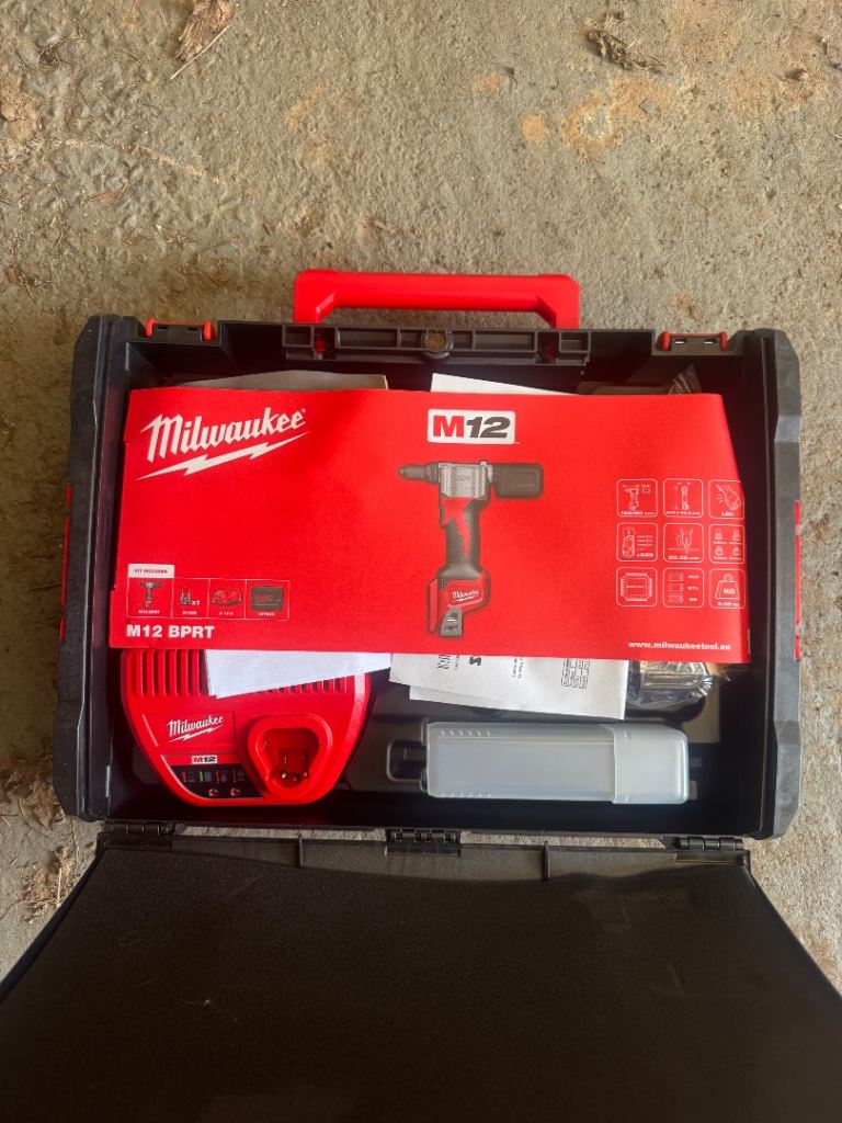 Brand new Milwaukee M12 BPRT Rivet Tool kit, still in its original packaging.
