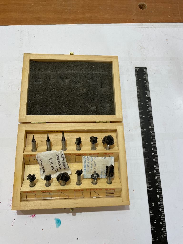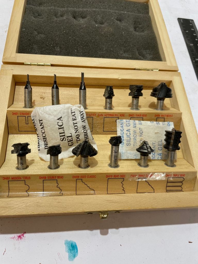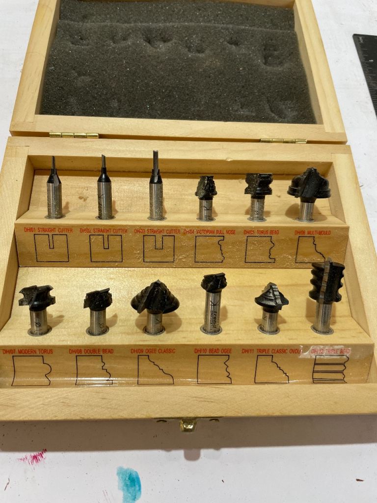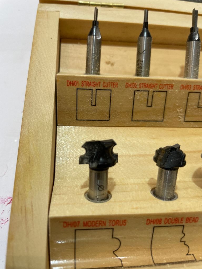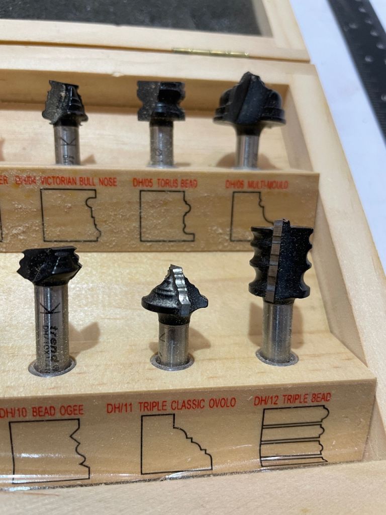 We have a 12-piece set of dolls house router bits made by TREND who manufacture router bits for the real construction industry. All these doll’s house router bits are tungsten carbide tipped, so they are hard and wear-resistant with a long cutting edge life, and they will give a clean cut on the timbers typically used in scale moulding manufacture. Nine of the cutters in this set are specifically designed for making doll’s house mouldings and the three straight cutters in the set can be used for rebating, grooving and slotting these mouldings, as well as producing window sash, casement sash, and other parts for doll’s houses.