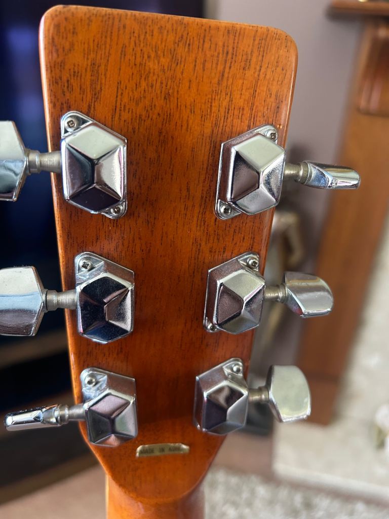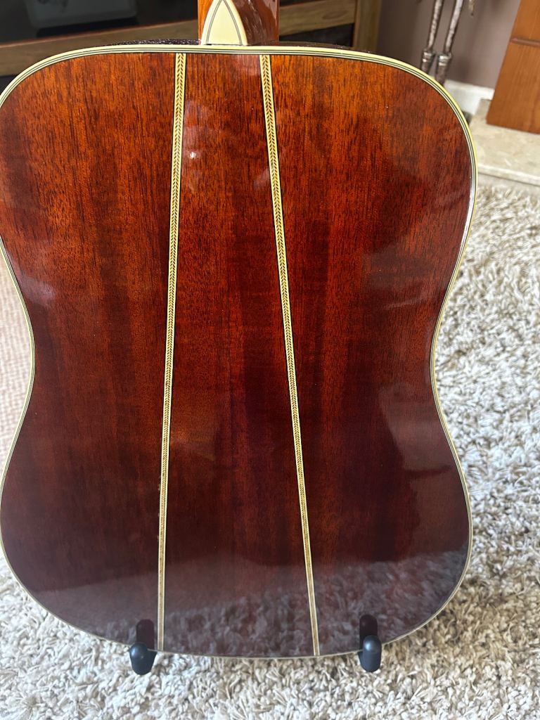 Mahogany neck, back and sides, a laminated spruce top, Rosewood fretboard, the guitar is modelled off a Martin D35.