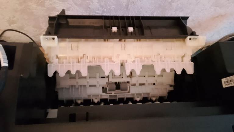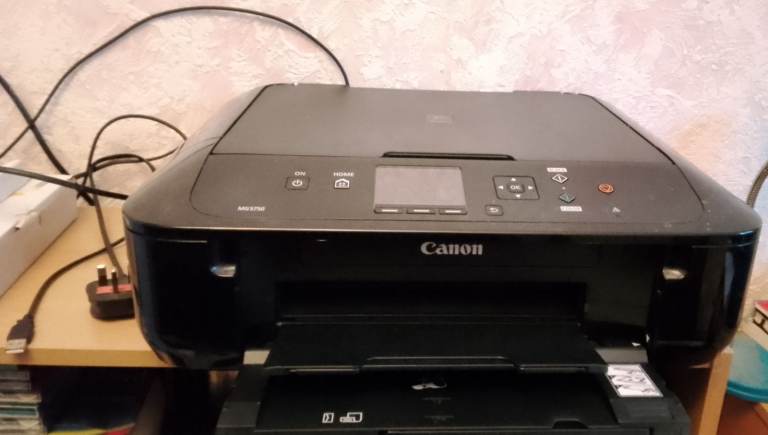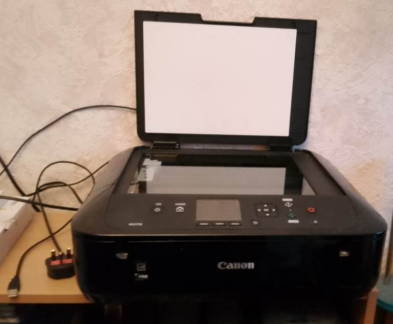 A Canon Pixma MG5700 printer, needing some attention - it often needs to be recalibrated to print, and it scans intermittently. Comes with power and USB connectors, can be used wirelessly. Also comes with DVD setup, and various manuals/guides for setup and use