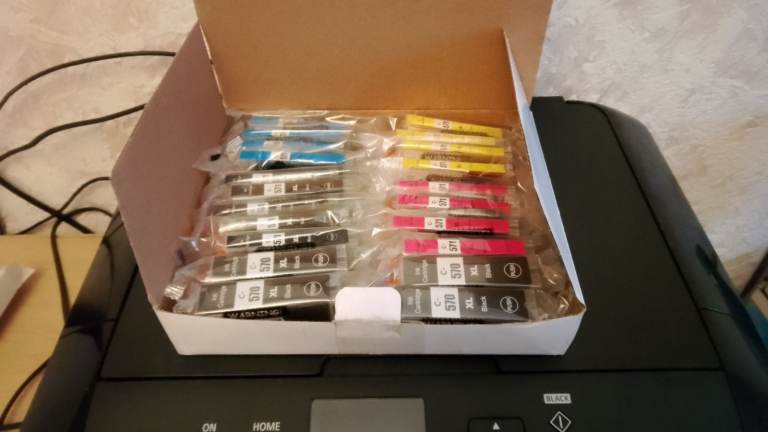 Sold with ink cartridges - 4 larger black, 5 smaller black, 4 cyan, 4 yellow, and 4 magenta