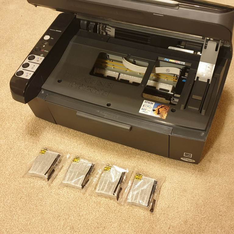 This Epson printer and scanner is in great working condition and comes with unused ink cartridges along with some already installed (though they may have dried out).
