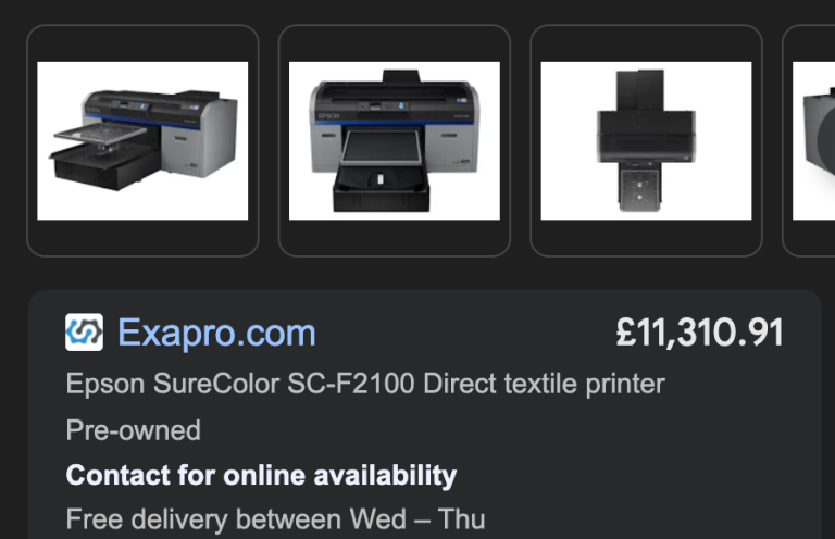 Posting for 12+ yearsEPSON SURECOLOR F2100 DTG PRINTER – READY-TO-RUN T-SHIRT BUSINESS – 3 PLATENS - £500 CASHBACK