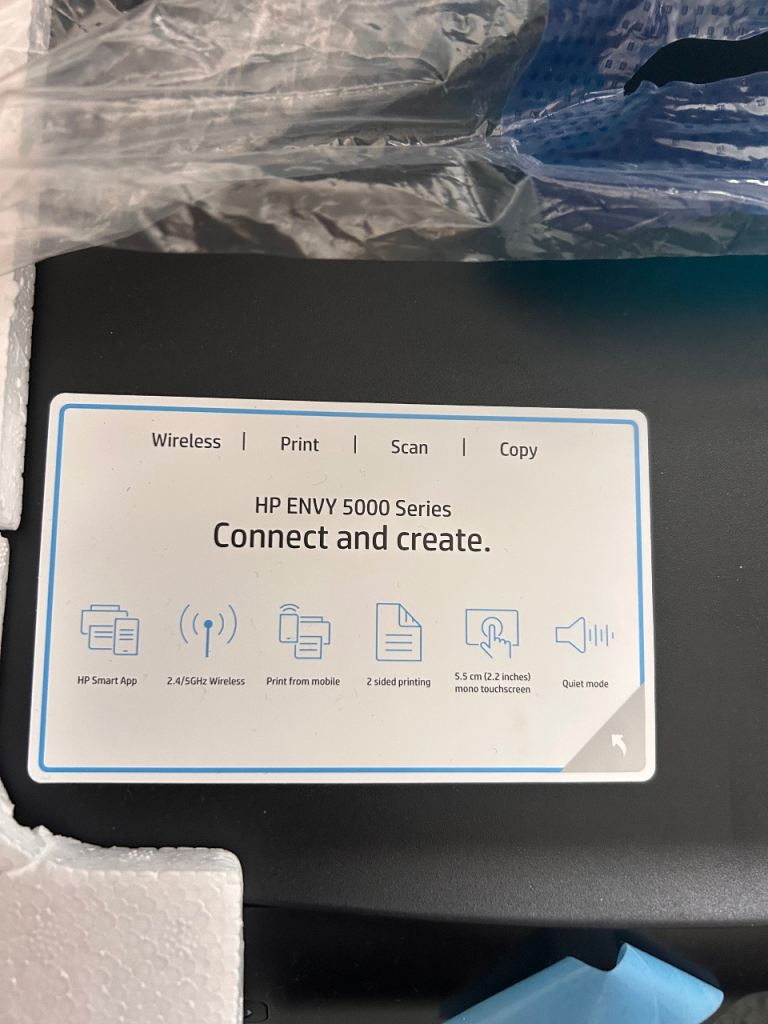 HP Envy 5000 series all in one printer. Works with smart app, 2.4/5 GHz Wireless, print from your mobile, 2 sided printing, 5.5cm (2.2 inch) mono touchscreen, quiet mode.