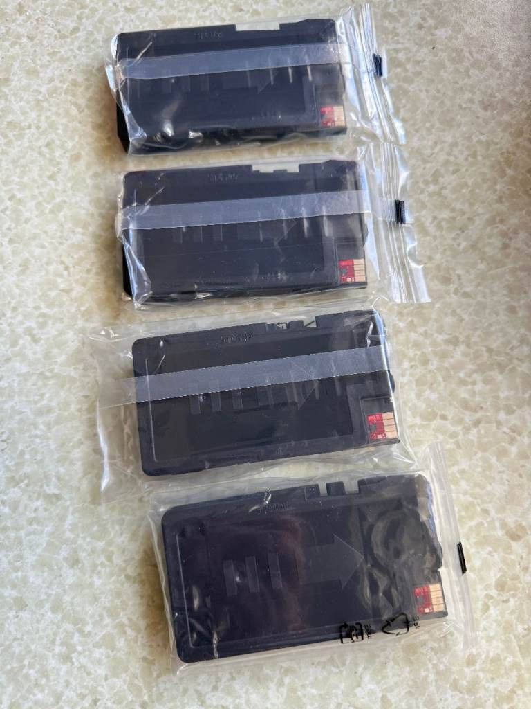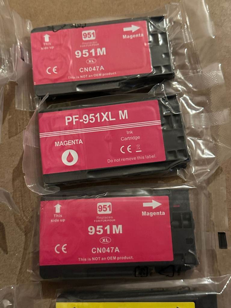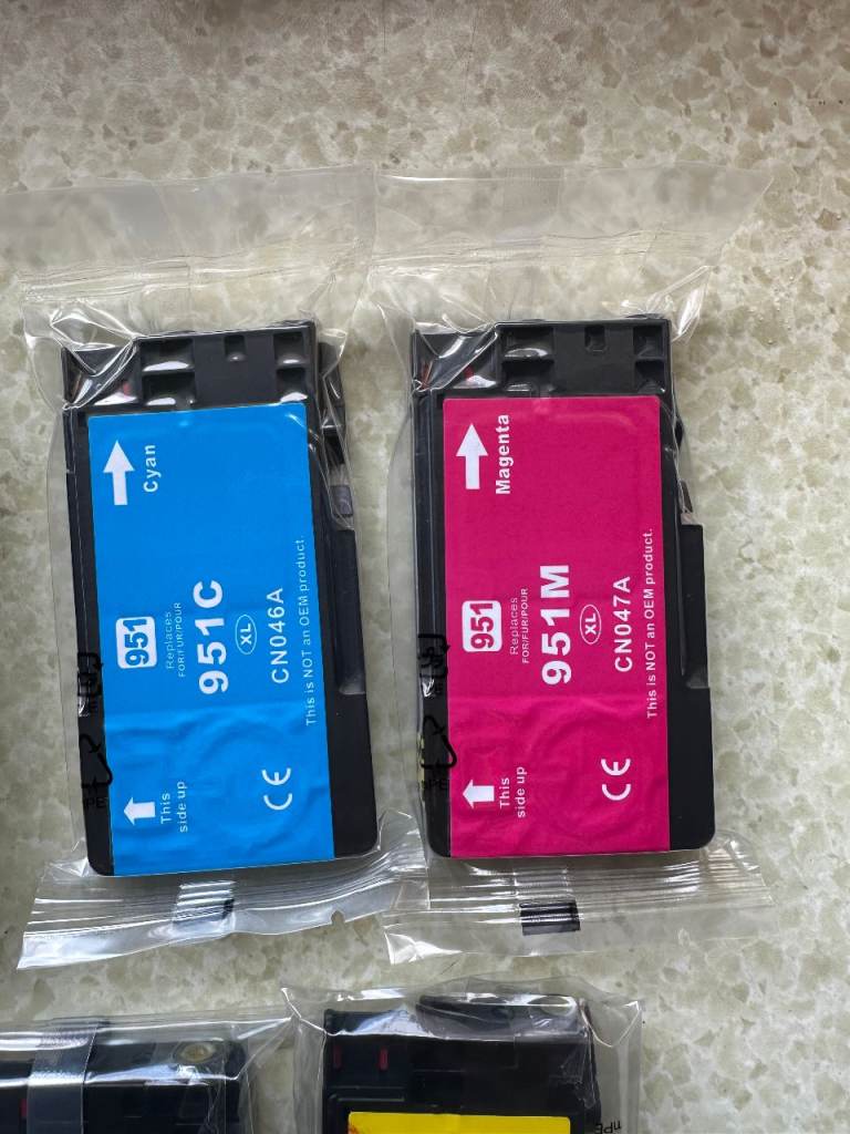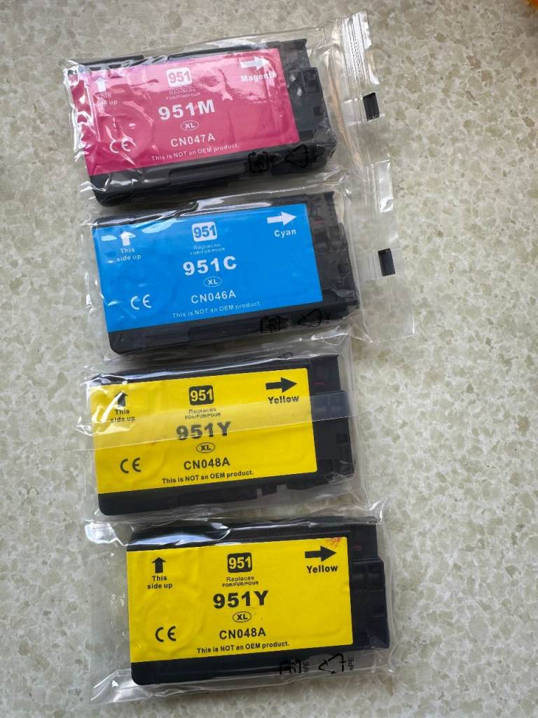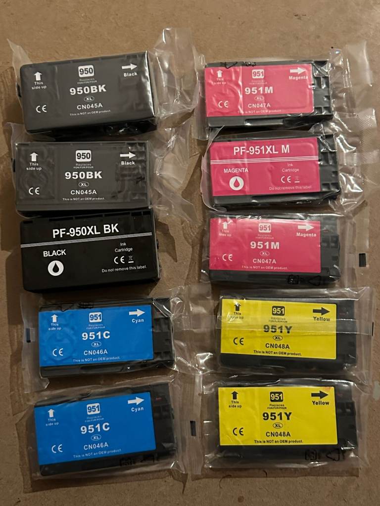 Two complete sets compatible HP 950 black & 951 colour XL ink cartridges, bought as printer ran out of yellow ink, & other colours were getting low. But first I replaced with a genuine yellow HP cartridge, I already had, but the printer wouldn’t work & gave an error message & wouldn’t print.