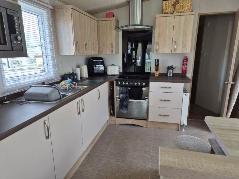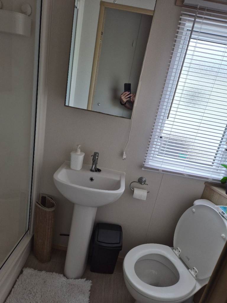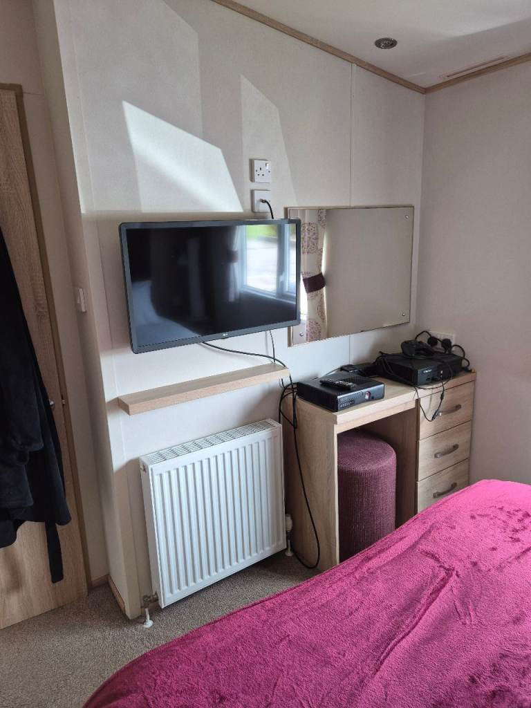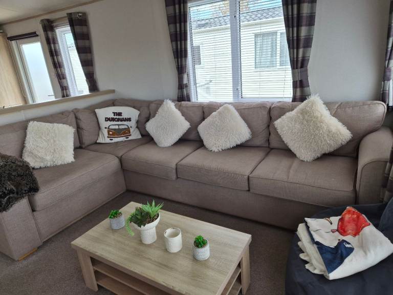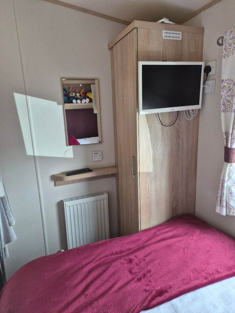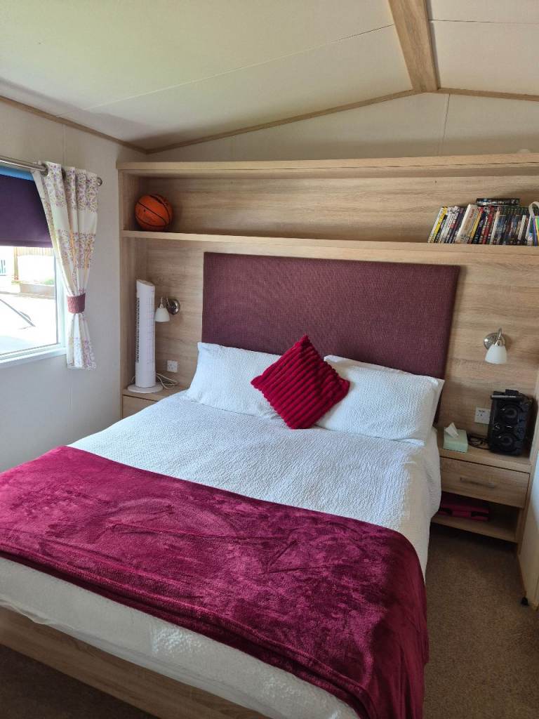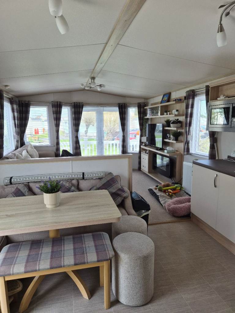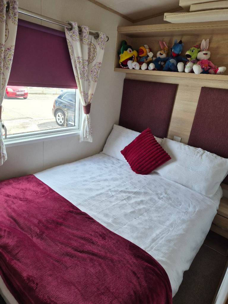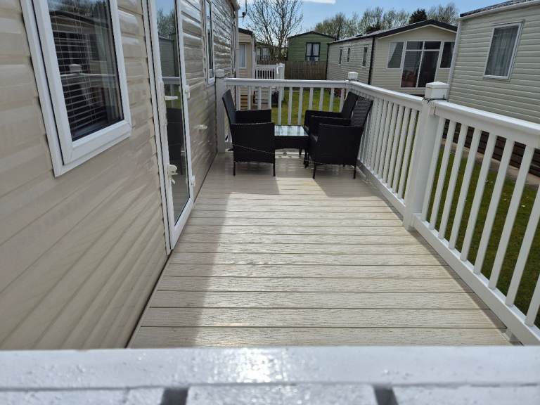 A beautiful 2 bedroom 6 birth caravan sited on Regent bay holiday park ,open 12 months ,fantastic condition inside and out ,master bedroom with own bathroom comes with everything you need tvs outside furniture etc ,prominent position on park lovely gardens in front of van ,own parking space ,large decking to side and front ,new blinds fitted throughout contact me for more information ,built 2016,second bedroom is two single beds pull out double in lounge