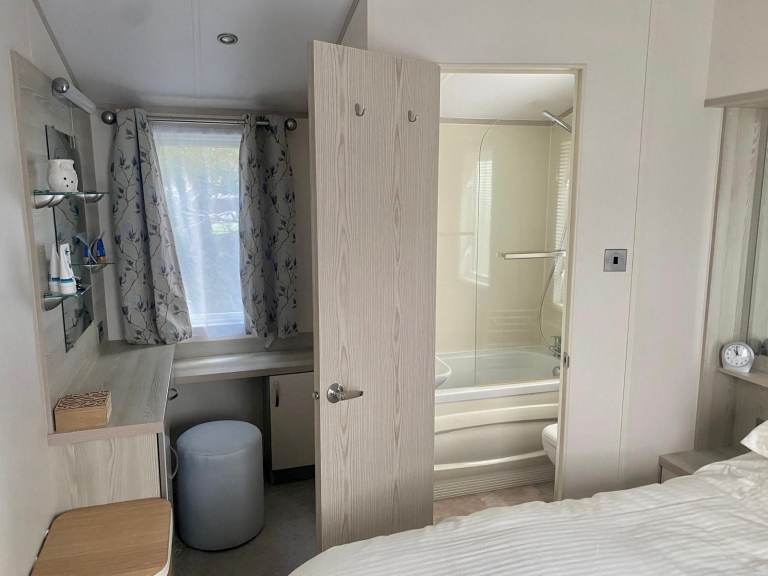 The twin room is perfect for your guests or can serve as extra space during longer getaways. It features two single 3ft beds, a bedside table, a wardrobe, and storage above the bed. The shower room is accessible from this bedroom, known as a ‘ Jack and Jill’ shower room. There is also access to this shower room via the hallway.