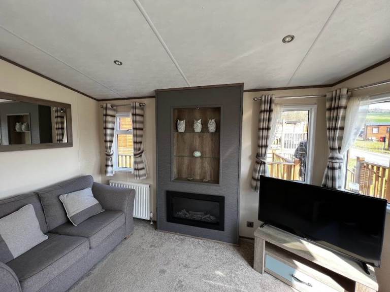 ✅ Bright open-plan living area with patio doors, a feature electric fireplace, and comfy sofas