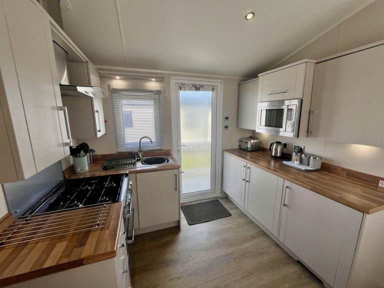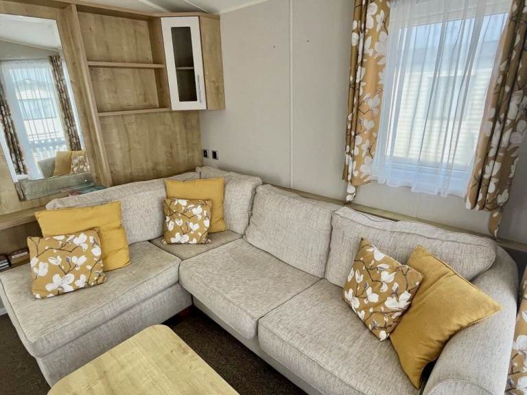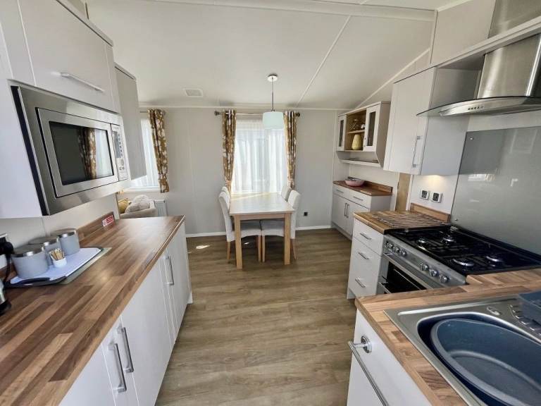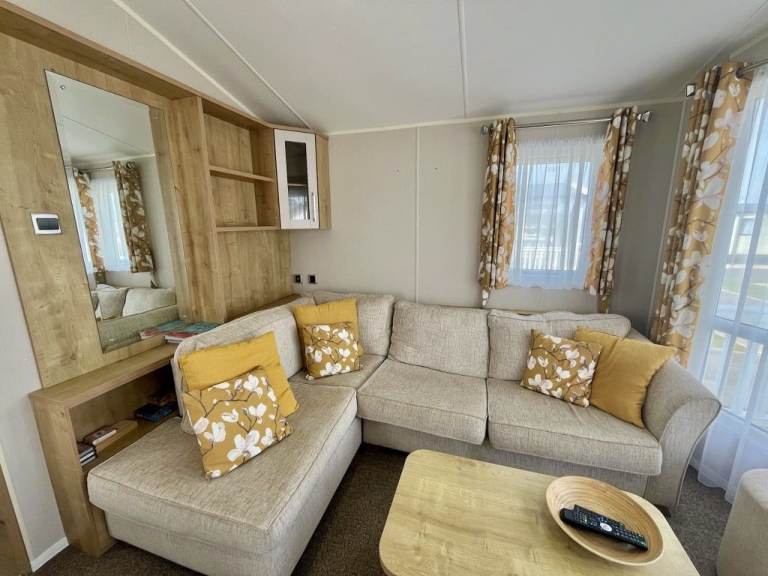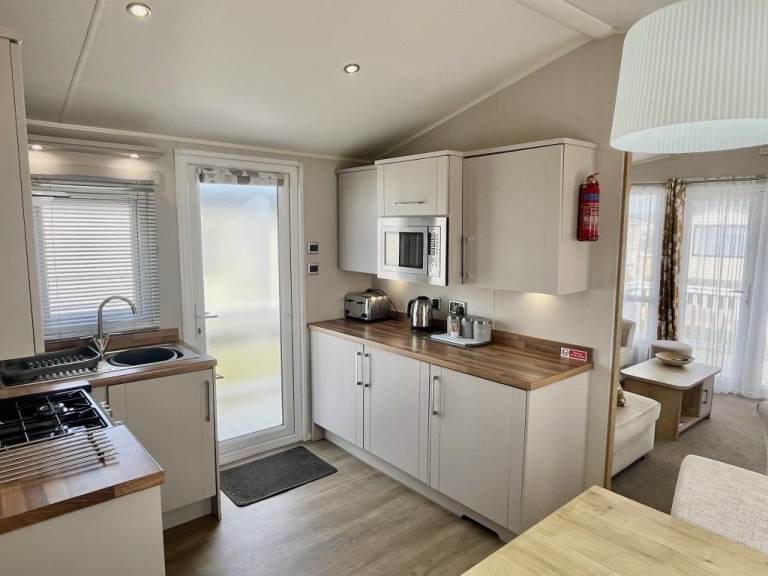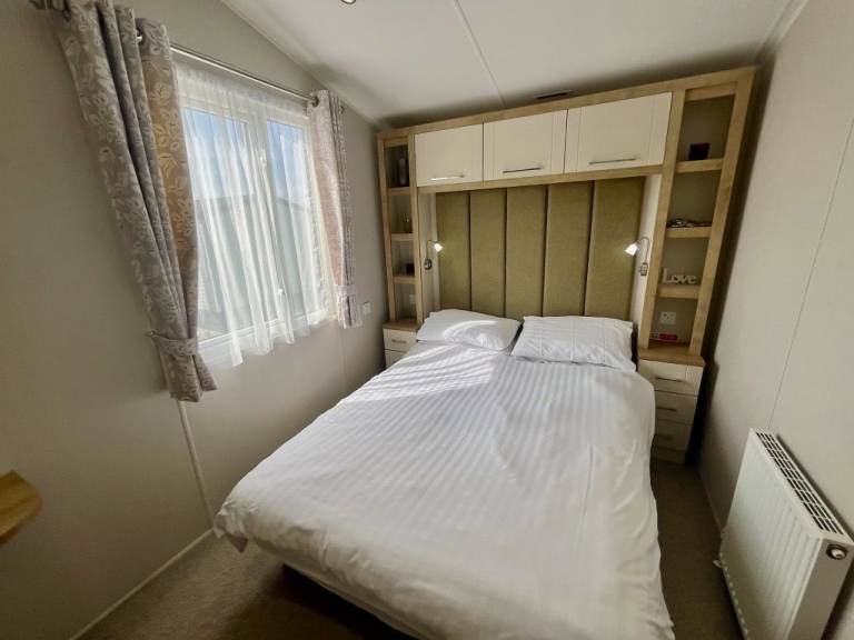 The bright living area, separate from the rest of the rooms, boasts its beautifully kept light oak interior. The L-shaped sofa doubles as a sofa bed, ideal for your guests. The large double patio doors leading onto the front deck let that gentle summer breeze in. During the colder months, escape to the living area and enjoy the warmth from the electric fire whilst sitting on a comfortable armchair.