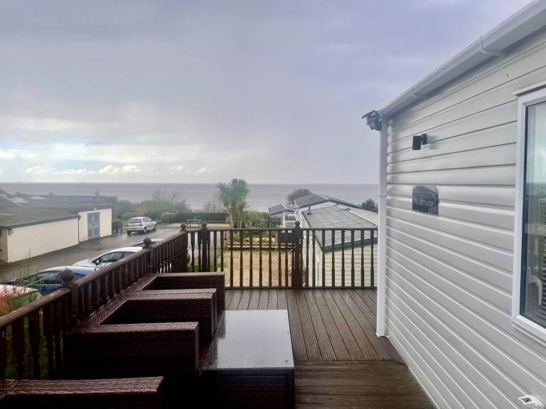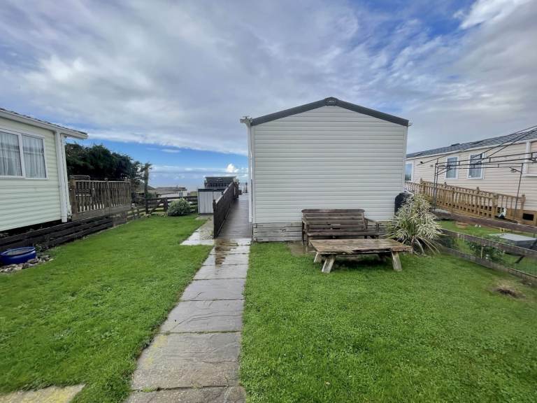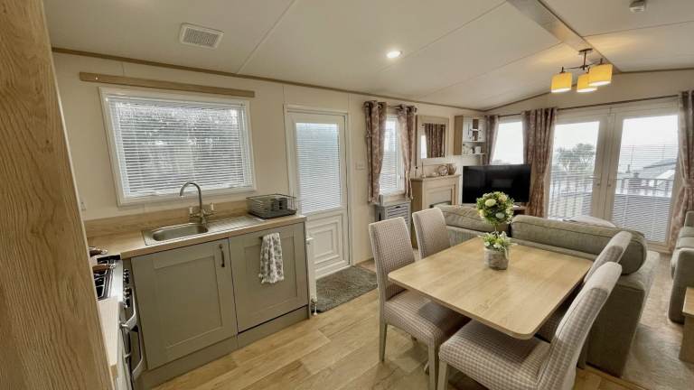 The well-furnished living area creates a cosy atmosphere that makes you feel at home. It includes a two-piece sofa suite, a footstool, a coffee table, a TV cabinet and a stunning fireplace. The double patio doors invite a gentle breeze to flow in during the warmer months, creating a fantastic space for outdoor dining.