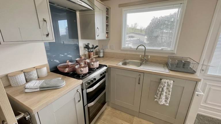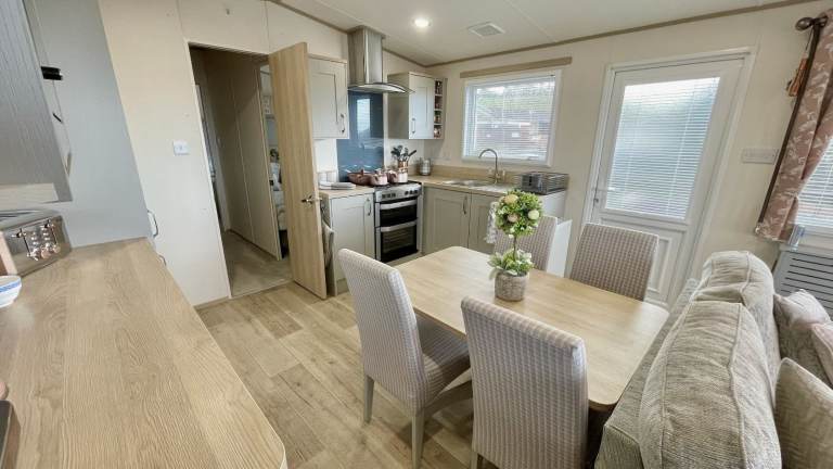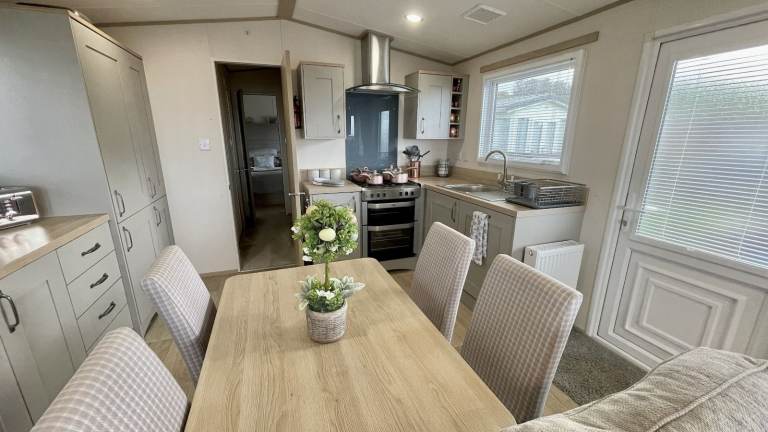 The well-equipped kitchen and dining area have everything you need to kickstart your holiday. It includes an integrated fridge-freezer, microwave, washing machine, dishwasher, and a gas oven with a hob. The large cupboards and drawers provide ample storage space for all your kitchenware. The dining table, accompanied by four comfortable chairs, is perfect for enjoying family meals together.