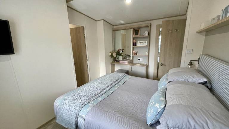 The well-appointed double bedroom features a comfortable bed, bedside tables, a built-in wardrobe, and a stylish dressing table with a stool. This room is complete with an ensuite WC and washbasin.