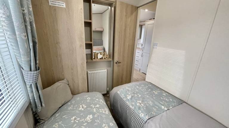 The twin bedroom awaits your guests, offering a warm and inviting space that can also serve as extra storage space for longer getaways. It boasts two single beds, a bedside table, a wardrobe, and shelving above the bed.