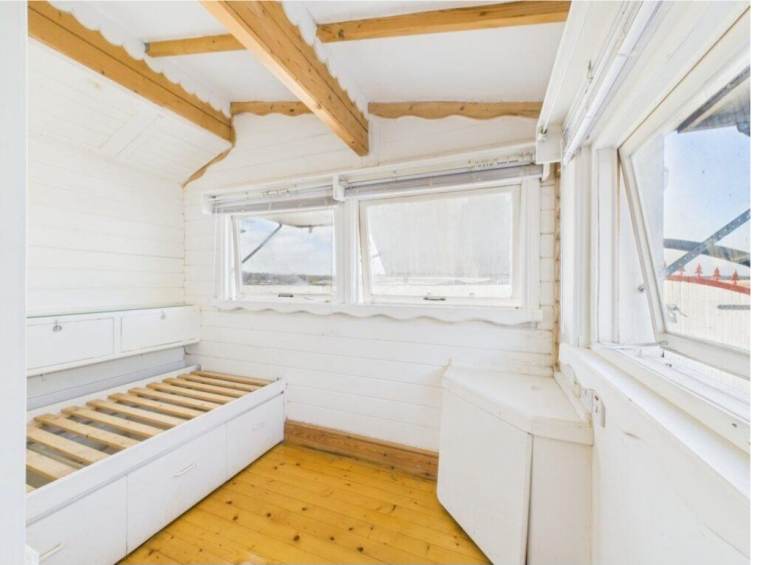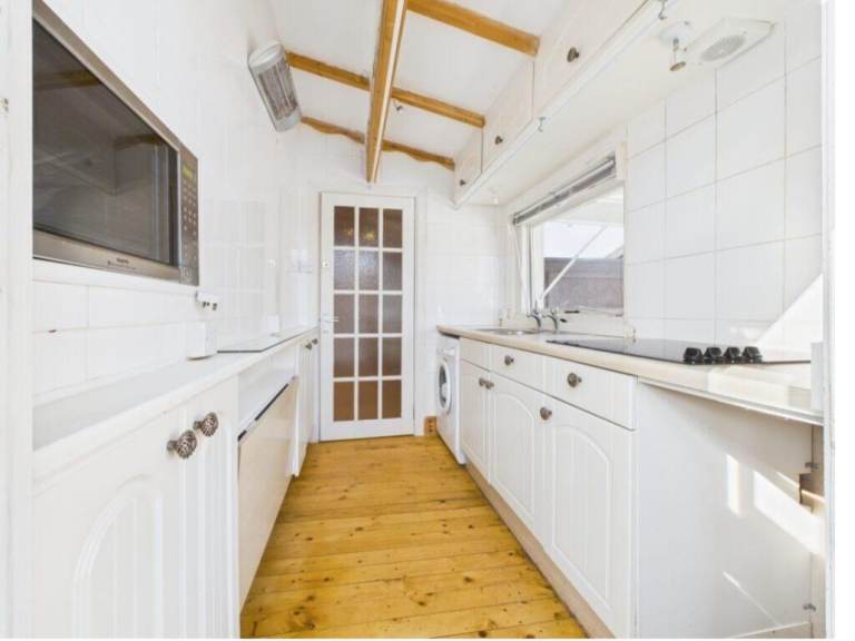 storage, electric hob and washing machine. Leads to central side facing lounge area with storage. Rear facing bedroom with