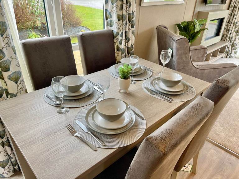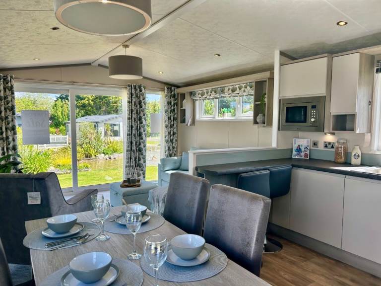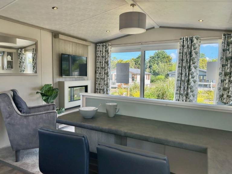This premium holiday home features a striking open-plan layout, highlighted by expansive floor-to-ceiling windows and a sliding patio door that flood the space with natural light and open to an area for your decking —ideal for relaxing, dining outdoors, or simply soaking up the peaceful surroundings.