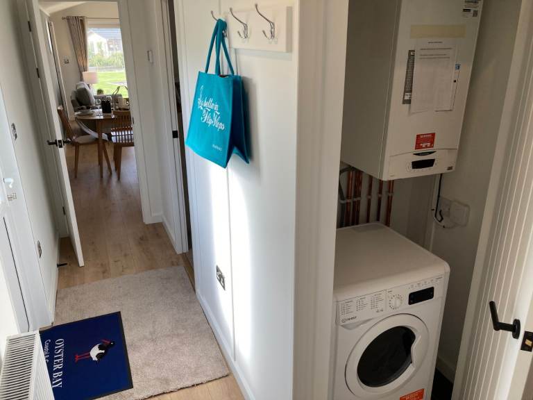 The wooden floors contrast beautifully against the white walls and doors of the hallway that links the bedrooms and bathrooms to the vast open plan living space. High-end fixtures and fittings like anthracite door handles and chrome electrical switches and sockets add those luxury feels. The boiler cupboard houses a washing machine and tucks the laundry away in a discreet location.