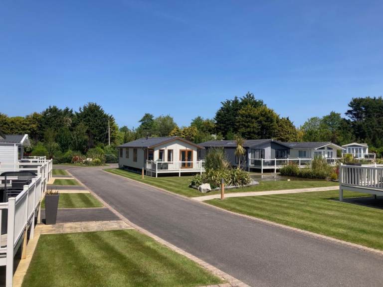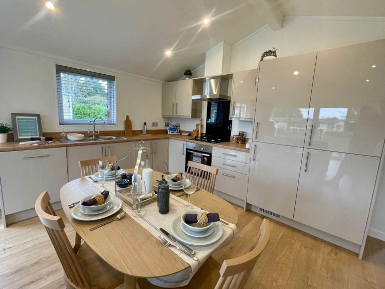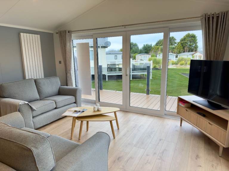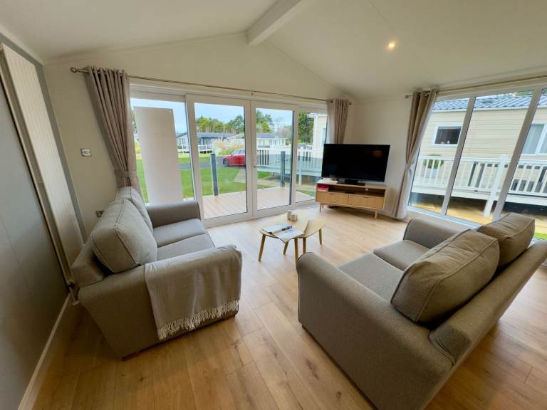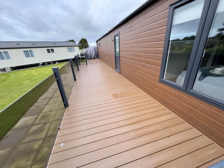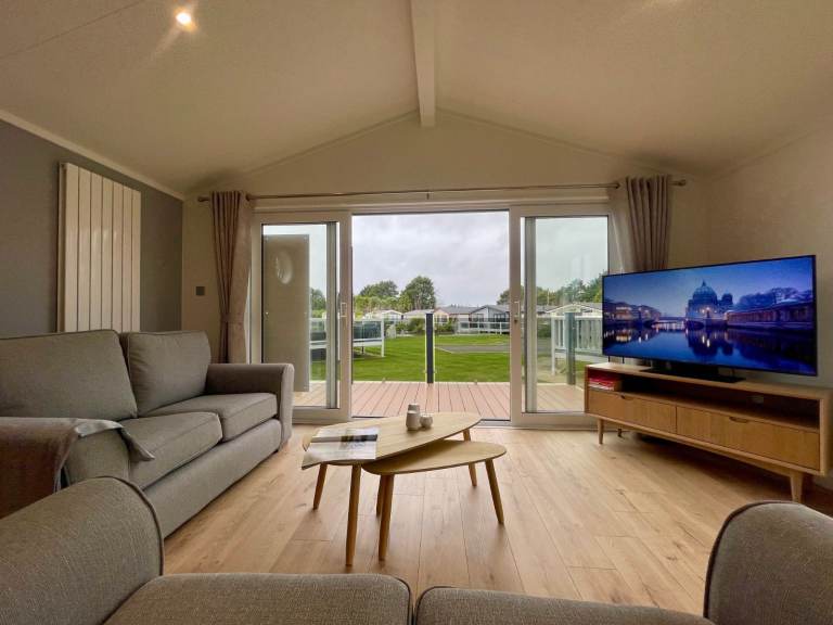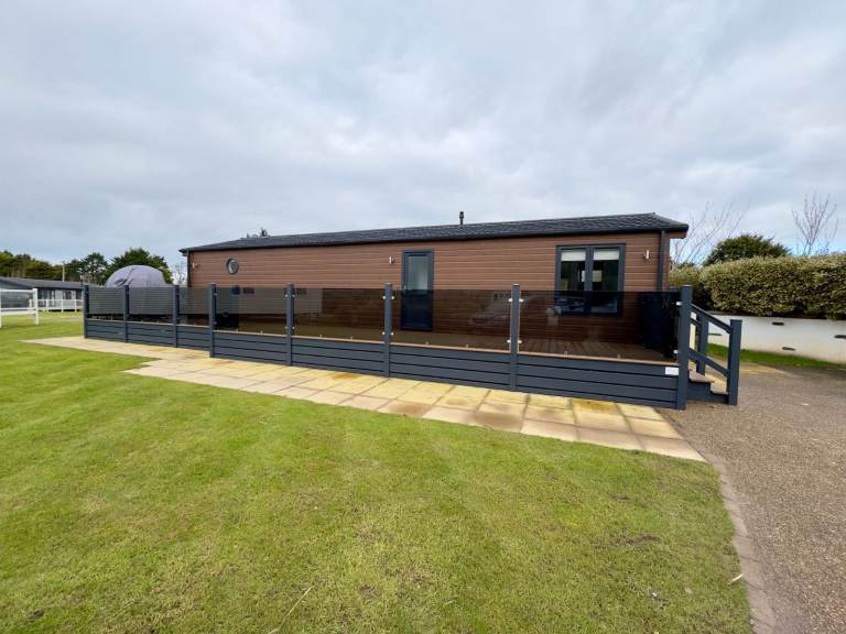 Be the first to own this unique luxury holiday lodge that includes a huge external decking system and located on an incredible pitch with water-feature views, a parking bay for two cars and a very special private raised BBQ/seating area to the rear.