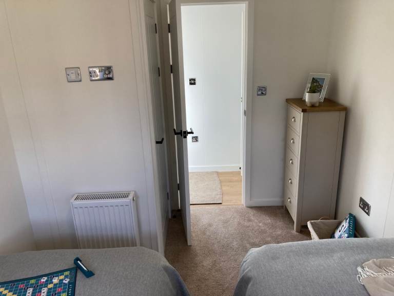 In the rear quarters there is a twin guest bedroom offering two full-size single beds, a walk-in storage cupboard and free-standing solid wood drawers. The wall reading lamps are set in and look very smart! Roman blinds and deep upholstered headboards ensure your guests will stay in pure comfort.