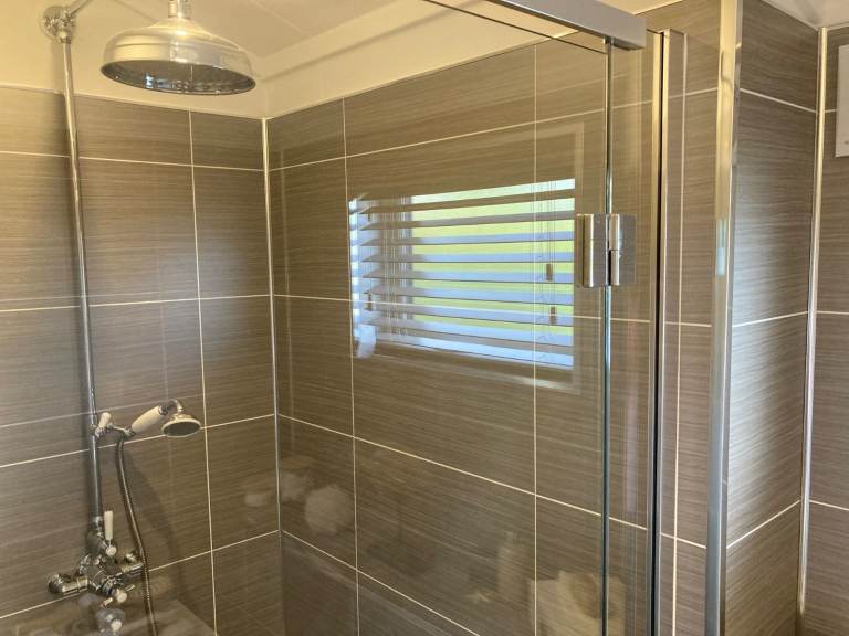 The main bathroom features a full-size bathtub and vintage accents in the form of the shower heads, taps and radiator-cum-towel heaters. Everything in the bathroom screams high-end including solid floor and wall tiling and powered lighted mirror unit.