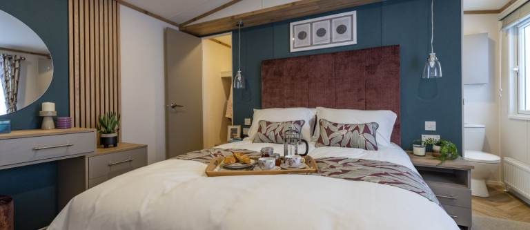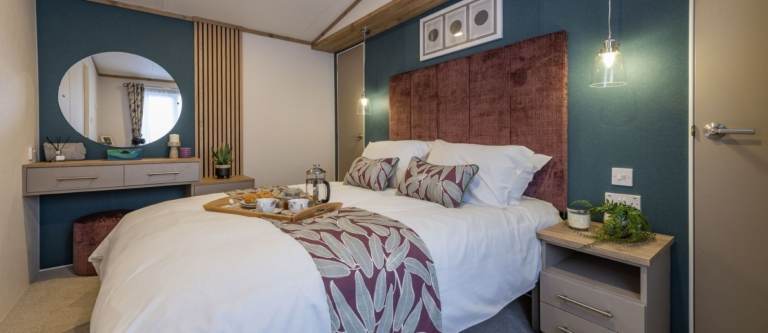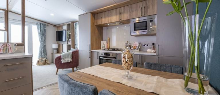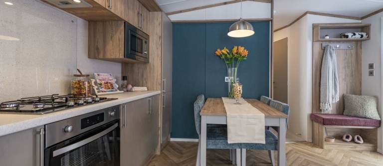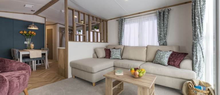 The Regal Hemsworth at Bredon View Holiday Park offers a perfect mix of contemporary style and spacious comfort. Inside, you’ll find a bold yet balanced interior design, with teal feature walls and soft pink furnishings creating a fresh, modern look. Vaulted ceilings and large windows flood the open-plan living area with natural light, giving it a bright and airy feel.