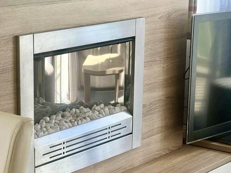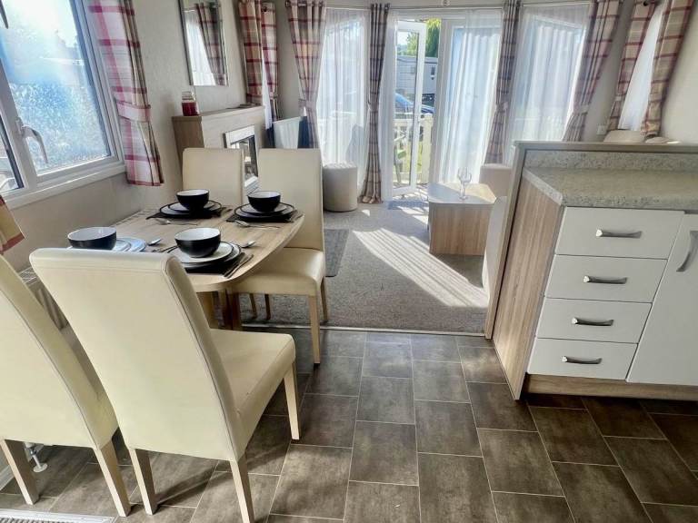 The bright, open-plan living area offers a relaxing space after a day spent exploring the park and its surroundings. It features a comfortable L-shaped sofa that easily converts into a bed for guests. The elegant stools, along with the coffee table and TV shelf, complement the room’s decor. A feature fireplace adds warmth during the colder months at Butlins, while the double patio doors are a perfect addition, allowing the summer breeze to flow through.