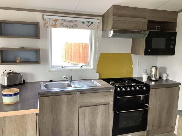 Inside, you’ll find a light, open lounge area, a fully fitted kitchen with cooker, microwave, and fridge freezer, and a dining area with table and seating. The caravan benefits from double glazing and central heating, making it comfortable throughout the season.