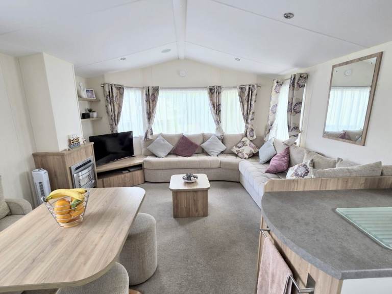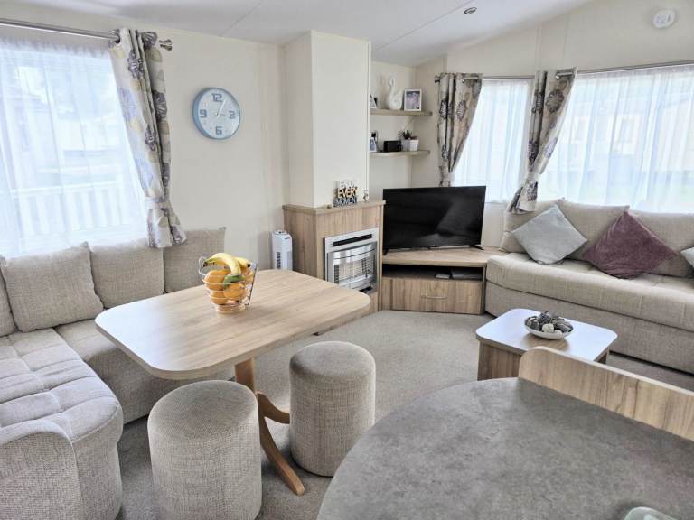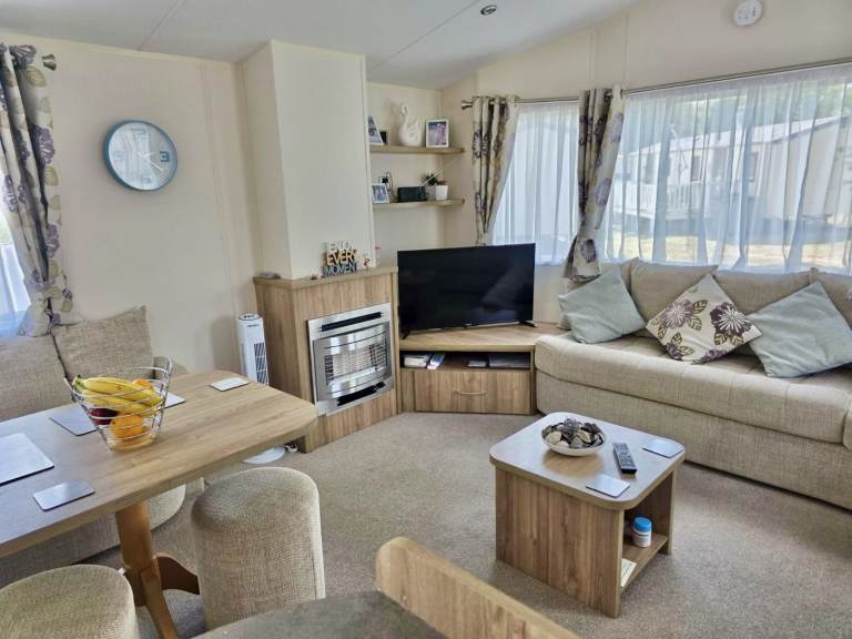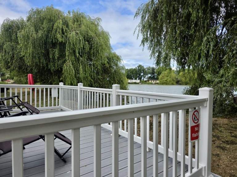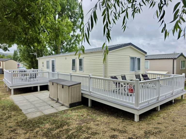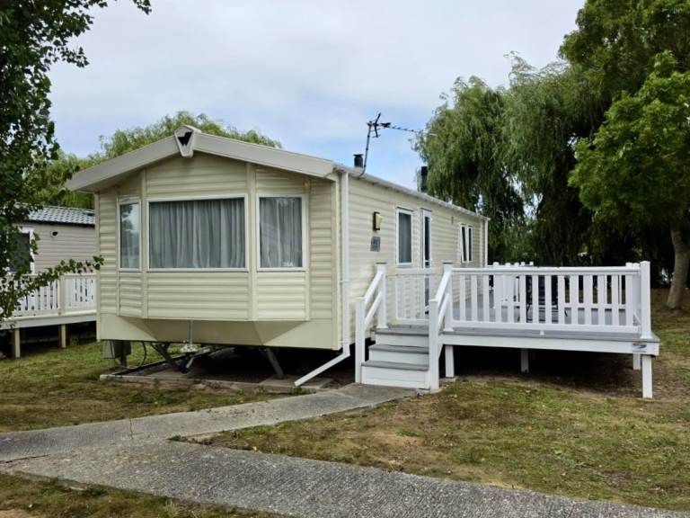 This 2014 Willerby Rio Premier is a static caravan for sale at Butlins Resort in Minehead, Somerset. This well-maintained holiday home sits on a beautiful pitch, Exe Cove 36a, overlooking the lake. The Willerby Rio Premier features a spacious wrap-around deck, offering room for two seating areas, and includes a parking space.