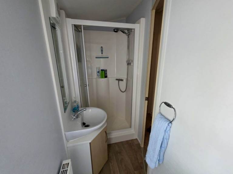 The family shower room includes a spacious shower cubicle, a WC, and a washbasin with a cabinet for your bathroom essentials.