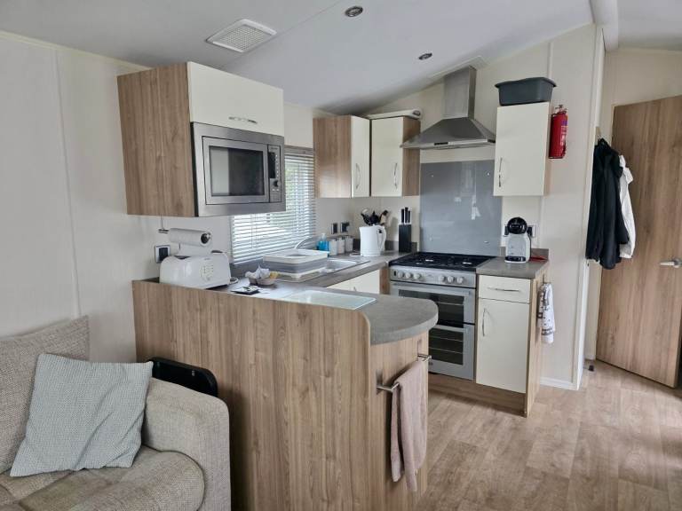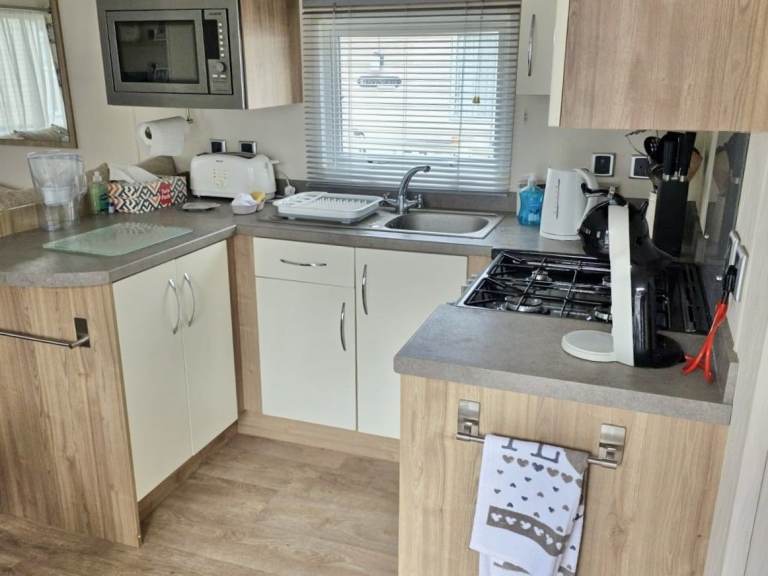 The well-equipped kitchen has everything you need to kick-start your holidays, including a large fridge-freezer, an integrated microwave, and a gas oven and hob. There are plenty of spacious cupboards and drawers for storing kitchenware and food preparation items.