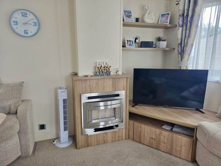 The living area boasts a well-furnished setup, complete with an L-shaped sofa, a coffee table, a TV cabinet, and wall shelves. The gas fireplace is an excellent addition during the colder months at Butlins. Adjacent to the living area is the family dinette, which features a comfortable L-shaped bench, two stools, and a rectangular dining table.