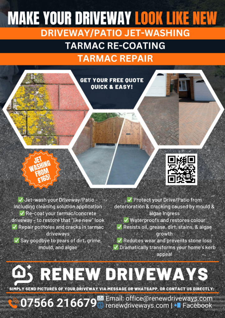 • Re-Coat Your Tarmac or Concrete Driveway – Restore your driveway to a “like new” appearance, enhancing colour, protecting against the elements, and extending its lifespan.
