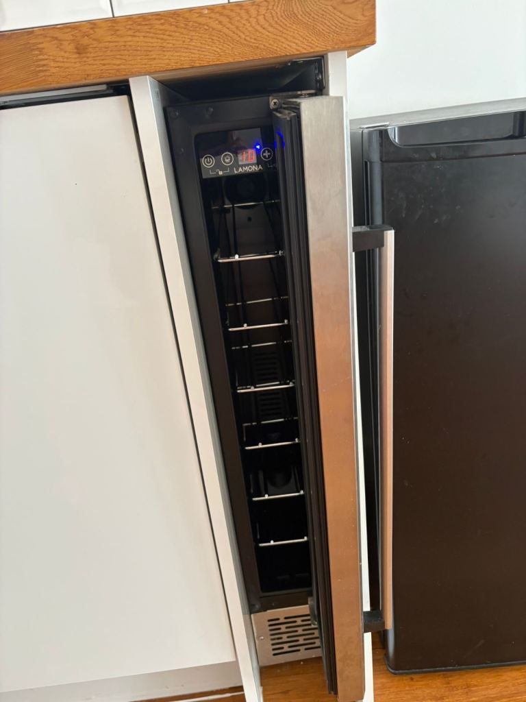 The accommodation comprises a spacious double bedroom and a modern kitchen fitted with contemporary units, including an integrated fridge, washing machine, and wine cooler. The bathroom features a two-piece suite with a bath and electric shower.