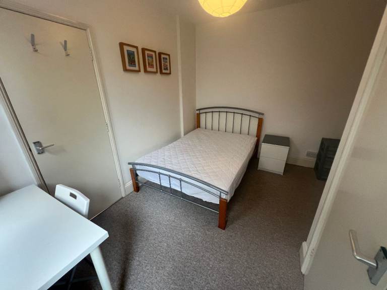 Double bedroom with comfortable double bed, large wardrobe, bedside chest, desk & chair.