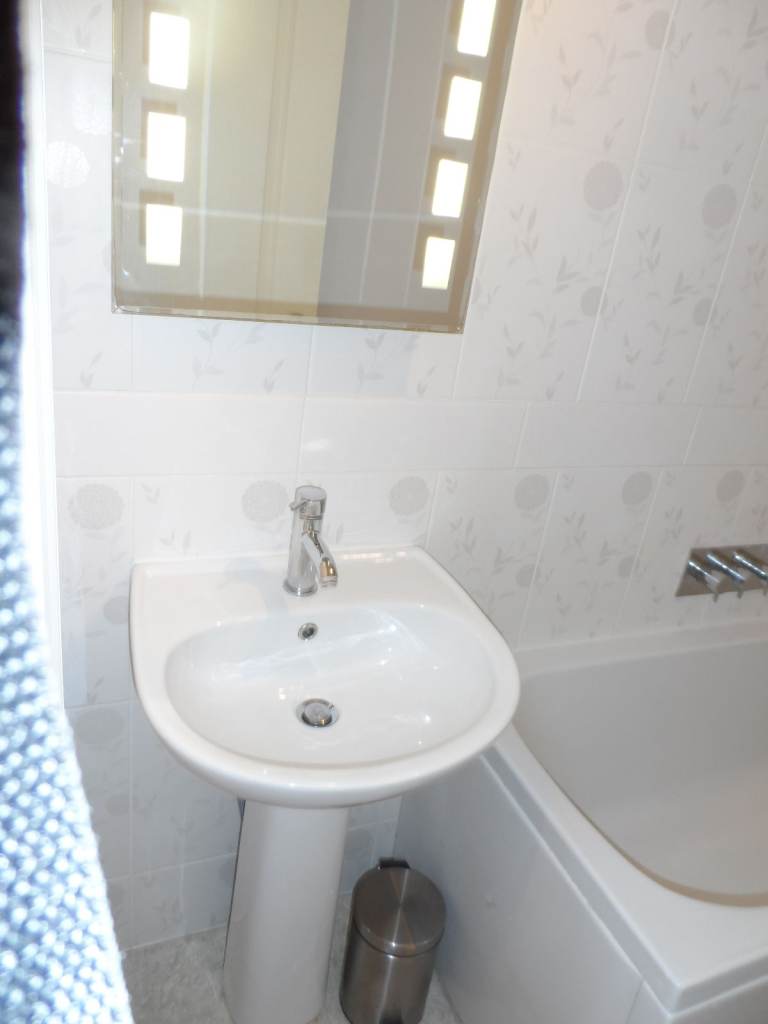 Has a full-size bath with a shower screen on the side, there is a wash basin and a mirrored